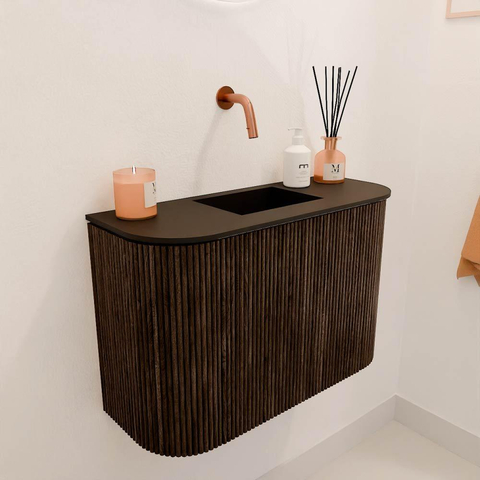 Het meubel valt meteen op door zijn verfijnde ontwerp met verticale groeven en de zachte rondingen aan beide kanten. De walnootkleur geeft een warme, natuurlijke uitstraling die moeiteloos combineert met verschillende badkamerstijlen. Door de combinatie van solide eikenhout en eikenfineer straalt het meubel kwaliteit en klasse uit. Zo voeg je een tijdloos element toe aan je badkamer dat zowel modern als uitnodigend oogt.