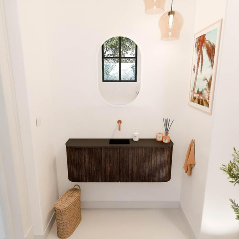 De combinatie van een ribbelfront en de warme walnootkleur maakt dit meubel tot een echte blikvanger. Het subtiele houtnerfpatroon en de elegante rondingen aan beide kanten geven het geheel een moderne, maar tijdloze uitstraling. Dit zorgt ervoor dat het meubel moeiteloos past in uiteenlopende badkamerstijlen, van klassiek tot eigentijds. Door de hoogwaardige afwerking straalt het meubel kwaliteit en vakmanschap uit, waardoor je verzekerd bent van een duurzaam en mooi product dat jarenlang meegaat.