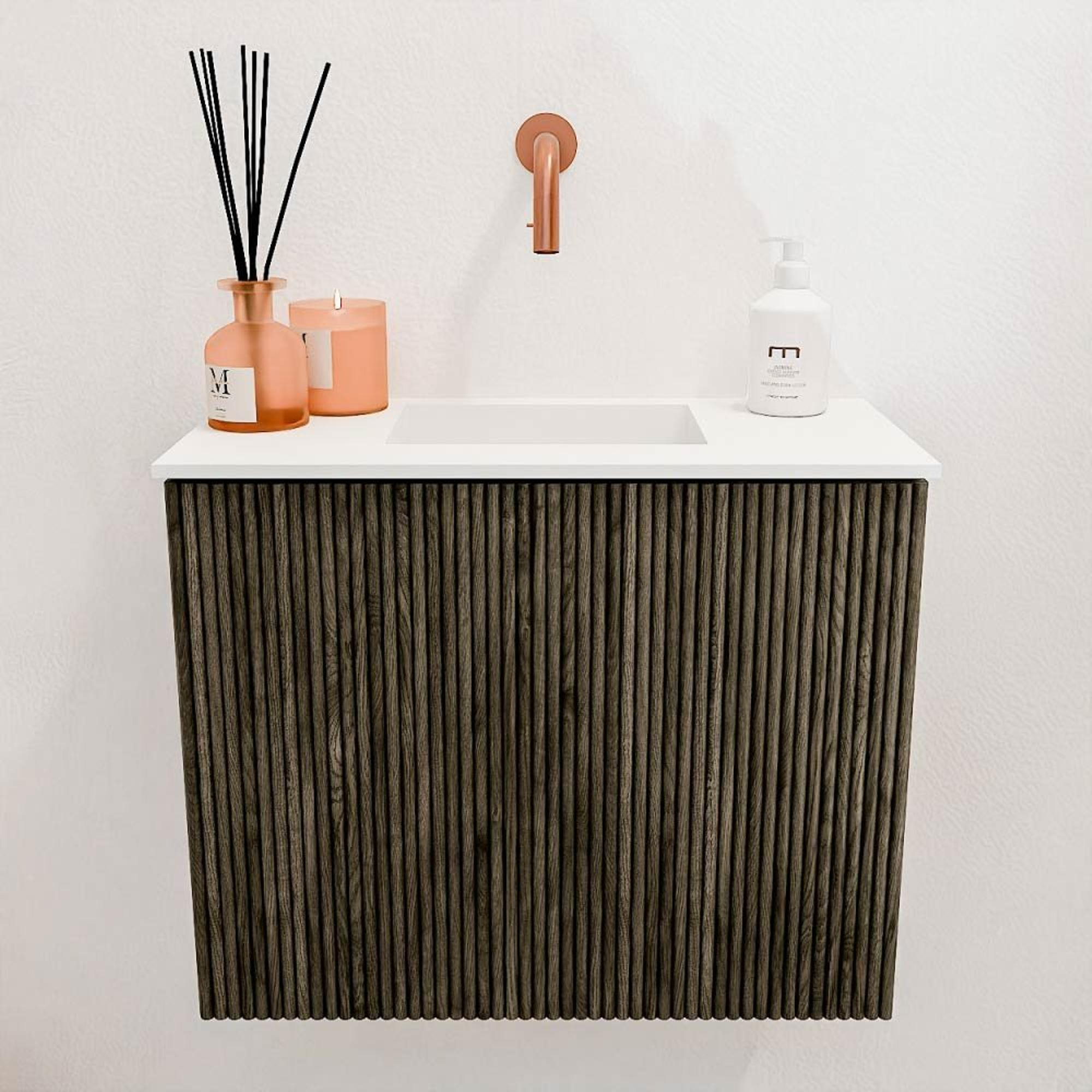 Het meubel valt direct op door het luxe, tijdloze design met verticale ribbels op het front. Deze subtiele details geven het geheel een natuurlijke en verfijnde uitstraling die je badkamer direct een upgrade geeft. De kleur Shadow in combinatie met de wastafel in Talc zorgt voor een harmonieuze en moderne look. Zo geniet je niet alleen van een praktisch meubel, maar ook van een echte blikvanger die jouw badkamer karakter en warmte geeft.