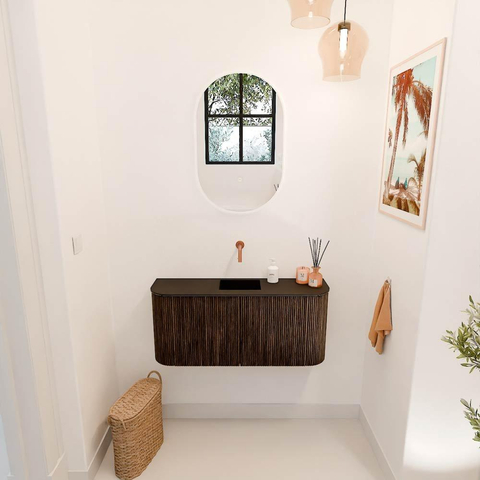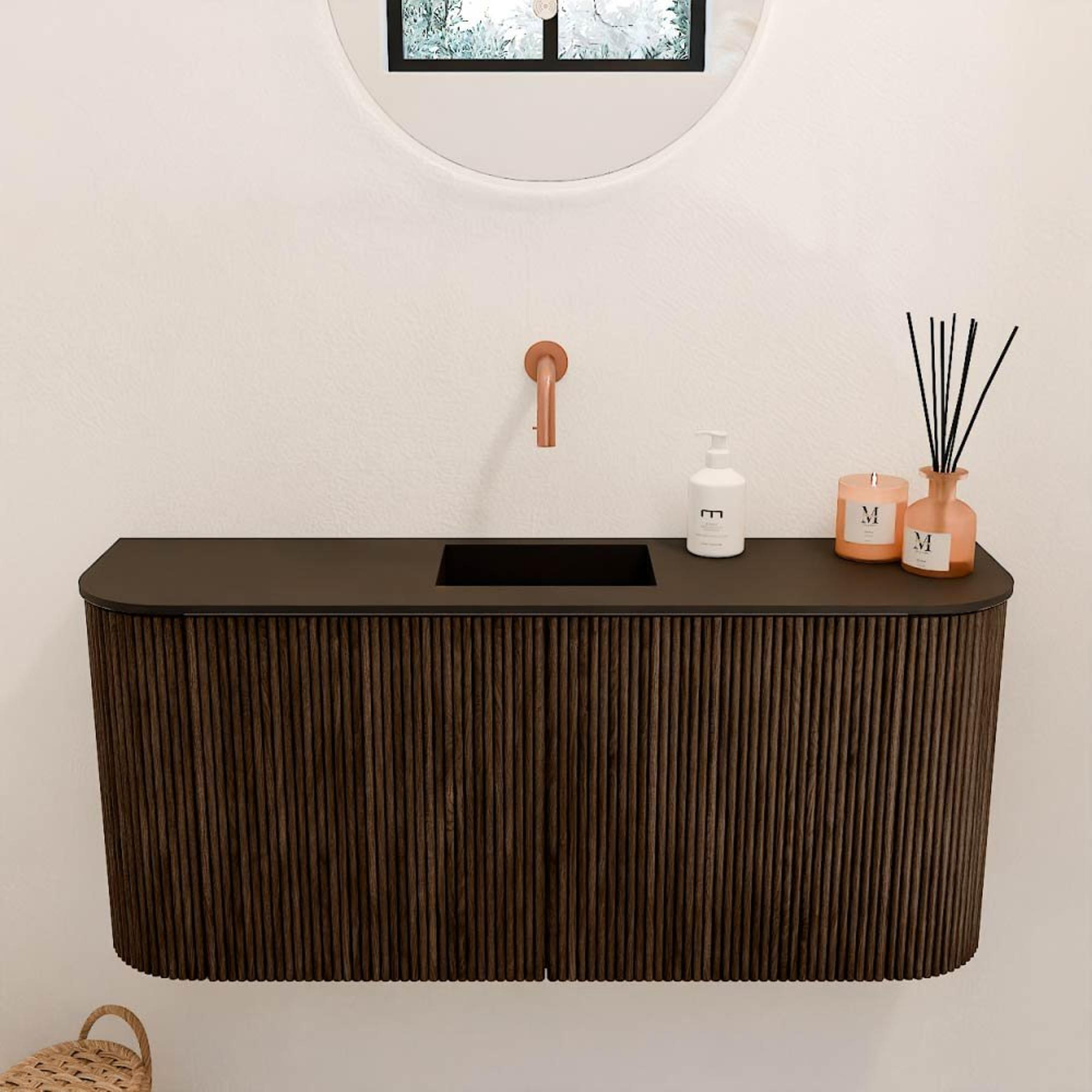Het meubel is uitgevoerd in een warme walnootkleur die direct een natuurlijke en uitnodigende uitstraling geeft. De fronten en zijkanten zijn gemaakt van massief eikenhout en eikenfineer, wat zorgt voor een authentieke en hoogwaardige look. De verticale ribbels in het wastafelblad voegen een subtiel maar luxe detail toe, waardoor het geheel een tijdloze elegantie uitstraalt. Dit maakt het meubel niet alleen een functioneel element, maar ook een echte blikvanger in je badkamer.