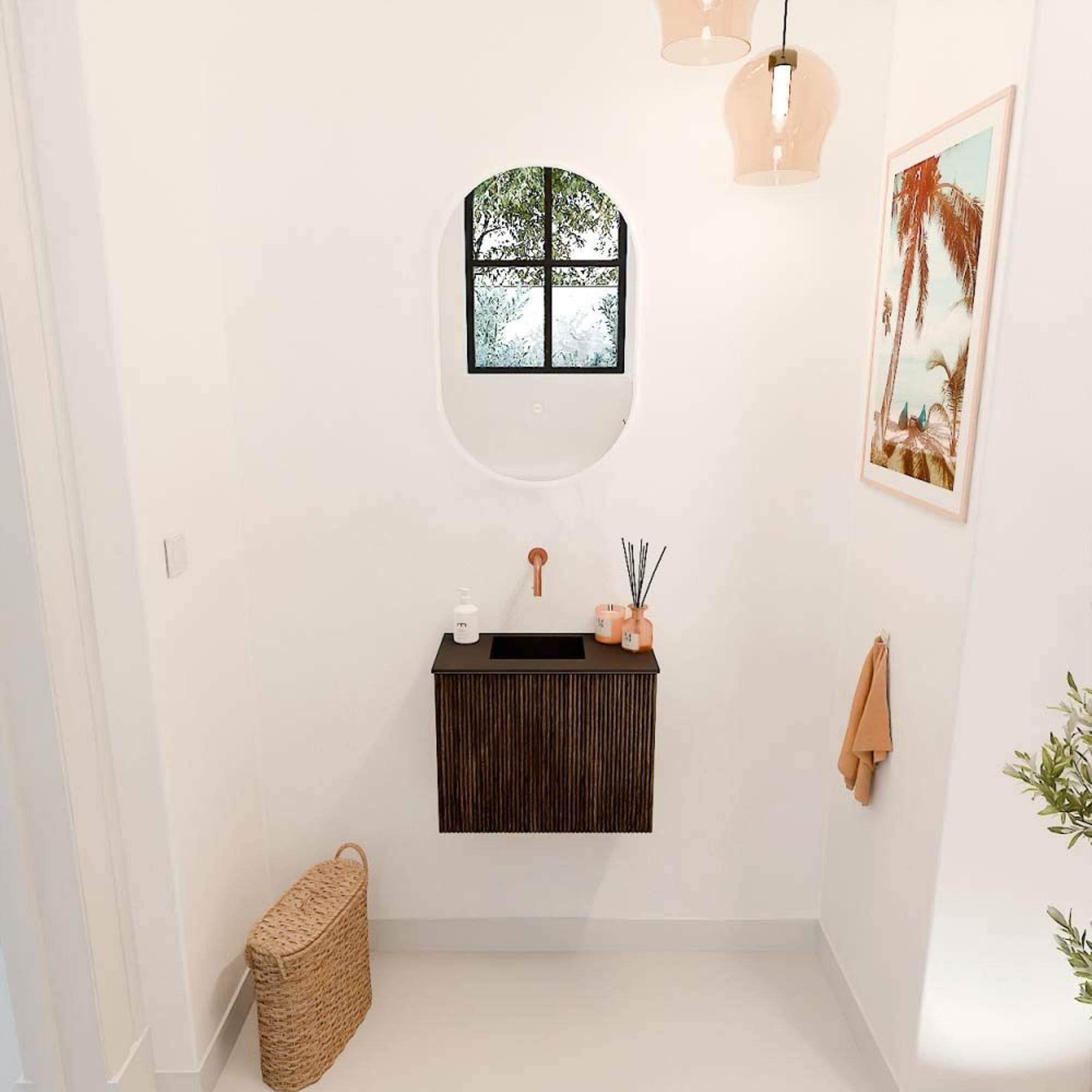 Met dit compacte en stijlvolle meubel geef je jouw toilet of kleine badkamer direct een warme en natuurlijke uitstraling. Het meubel combineert een prachtige walnootkleurige afwerking met de tijdloze charme van massief eikenhout, wat zorgt voor een luxe en duurzame sfeer. De wastafel is subtiel aan de linkerkant geplaatst, zonder kraangat, zodat je zelf de kraan kunt kiezen die het beste bij jouw stijl en wensen past. Dankzij het slimme ontwerp met een enkele deur benut je de ruimte optimaal en houd je alles netjes opgeborgen. Dit meubel brengt niet alleen functionaliteit, maar ook een gevoel van rust en elegantie in jouw badkamer, waardoor het een waardevolle toevoeging is die je dagelijks plezier geeft.