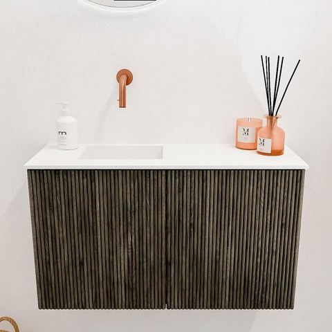 - Wastafel FAYE van Solid Surface in de kleur Talc, links gepositioneerd zonder kraangat