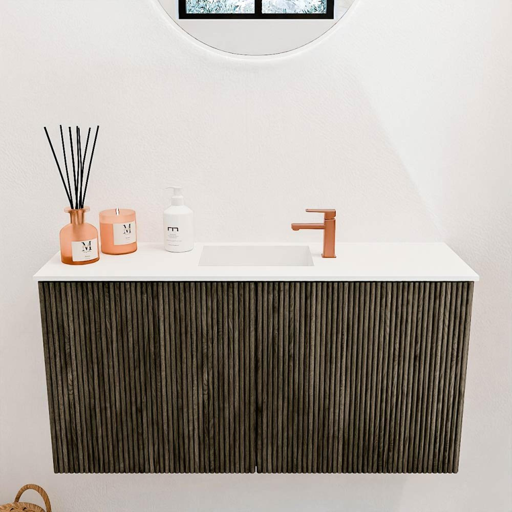 Het meubel valt direct op door zijn verfijnde uitstraling. De combinatie van massief eikenhout en eikenfineer met een verticale ribbelstructuur geeft het een natuurlijke en luxe uitstraling. Deze subtiele details maken het meubel tot een echte blikvanger in jouw badkamer. De zachte Shadow-kleur zorgt voor een warme sfeer, terwijl de wastafel in talc-kleur een frisse, lichte touch toevoegt. Zo creëer je een harmonieus geheel dat rust en stijl uitstraalt. Met dit meubel haal je een designstuk in huis dat niet alleen mooi is, maar ook jouw persoonlijke smaak perfect weerspiegelt.