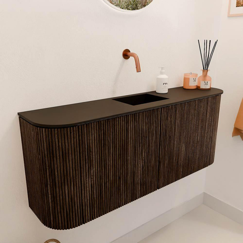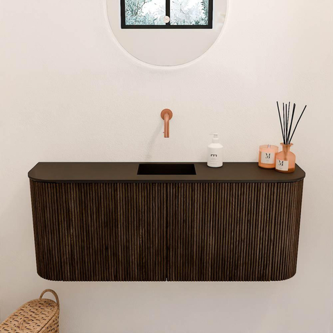 Met dit prachtige meubel geef je jouw badkamer direct een warme en natuurlijke uitstraling. De combinatie van een walnootkleurige onderkast met massief eiken en eikenfineer zorgt voor een tijdloos en stijlvol geheel. Dankzij de subtiele rondingen aan beide zijden oogt het meubel niet alleen elegant, maar ook uitnodigend en zacht. De geïntegreerde wastafel van Solid Surface voelt heerlijk glad aan en is bijzonder duurzaam, waardoor je jarenlang plezier hebt van dit meubelstuk. Zonder kraangat en met een centrale positie voor de kraan, biedt het volop vrijheid om jouw ideale kraan te kiezen en te installeren. Dit meubel transformeert jouw badkamer tot een plek waar je elke dag met plezier begint en eindigt, dankzij de perfecte balans tussen design en functionaliteit.