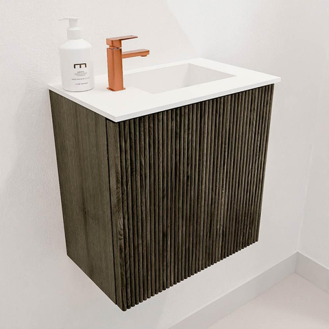 Het meubel valt direct op door het elegante design met verticale ribbels in het massief eiken front. De warme kleur Shadow geeft een natuurlijke en luxe uitstraling die je badkamer een unieke sfeer geeft. De wastafel in de zachte kleur Talc sluit hier naadloos op aan en zorgt voor een frisse, lichte touch. Door de combinatie van hout en Solid Surface materiaal ontstaat een harmonieus geheel dat zowel modern als tijdloos oogt. Dit meubel is een echte blikvanger die jouw badkamer een persoonlijke en stijlvolle uitstraling geeft.