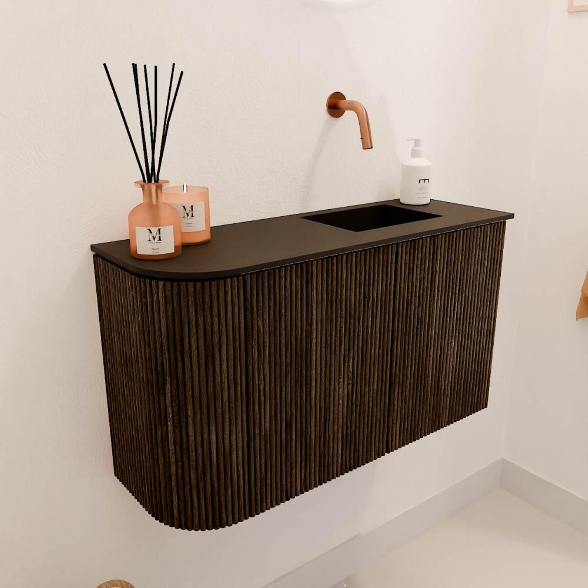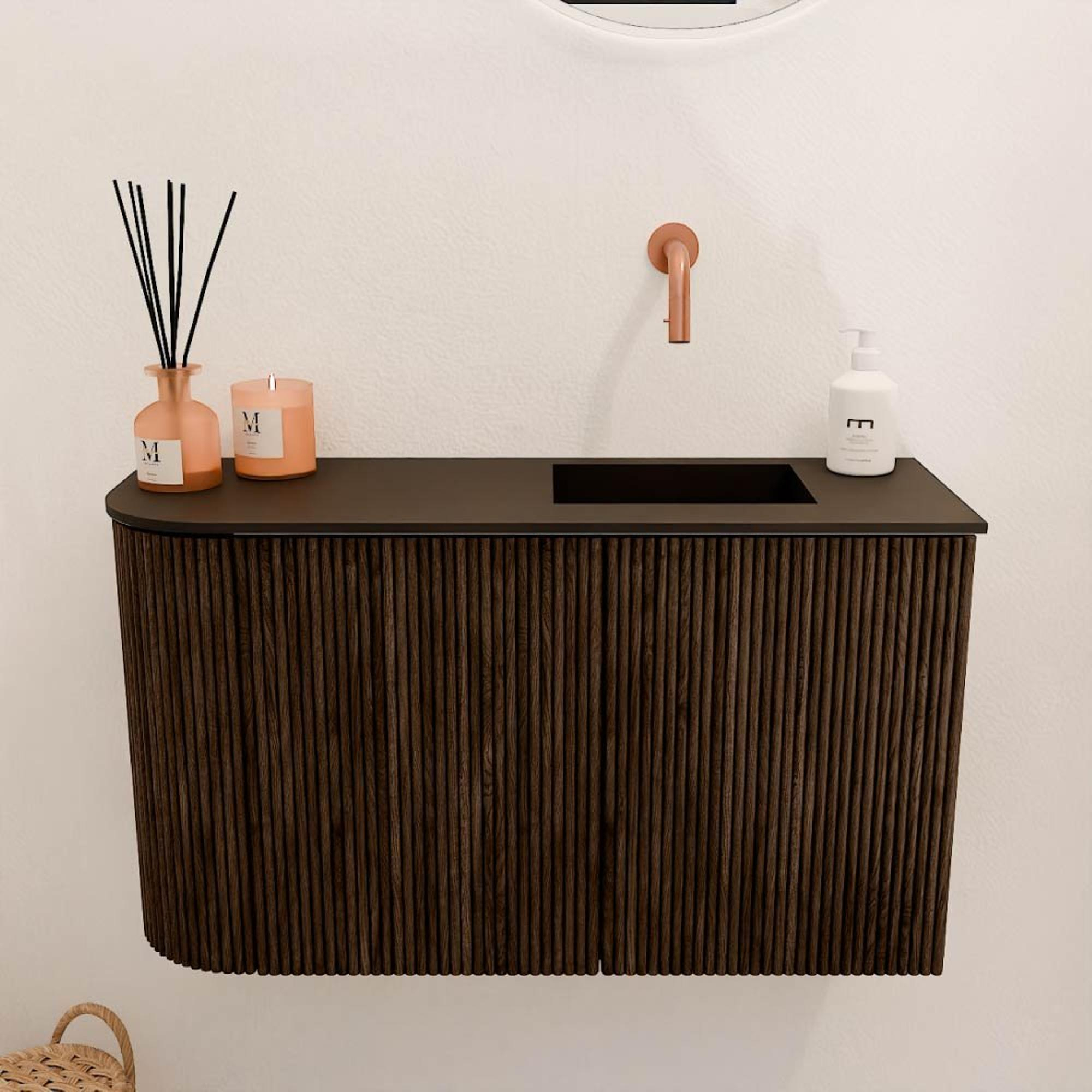 Het meubel valt direct op door de verticale ribbels op de fronten, die zorgen voor een subtiele textuur en een eigentijdse uitstraling. De walnootkleur geeft het geheel een warme, natuurlijke look die luxe uitstraalt zonder te overheersen. Dit maakt het meubel perfect voor wie houdt van een stijlvolle badkamer met karakter. Door het doordachte ontwerp met een afgeronde linkerzijde krijgt het meubel een zachte, uitnodigende vorm die de ruimte visueel verrijkt. Zo voeg je niet zomaar een meubel toe, maar een stijlvol element dat je badkamer compleet maakt.