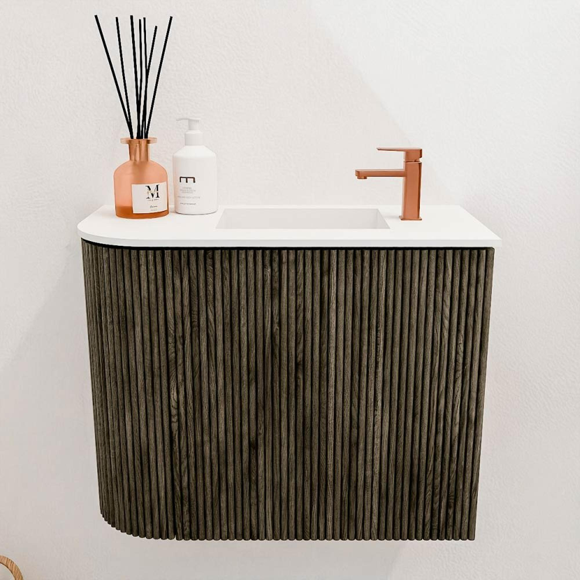 De unieke ronding aan de linkerkant van het meubel geeft het een onderscheidend en verfijnd uiterlijk. De combinatie van de donkere Shadow-kleur met de lichte Talc-wastafel zorgt voor een subtiel contrast dat jouw badkamer een moderne en warme sfeer geeft. Dit meubel is niet alleen een functioneel element, maar ook een echte blikvanger die jouw badkamer een persoonlijke touch geeft. Door het strakke design en de hoogwaardige afwerking past het moeiteloos in zowel klassieke als eigentijdse badkamers.