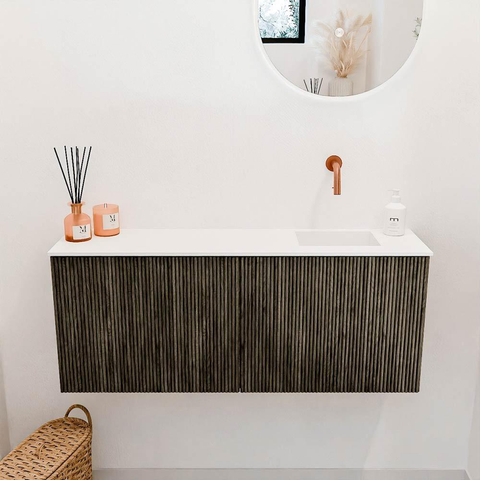 Het meubel valt direct op door het elegante verticale ribbelpatroon op de fronten, uitgevoerd in massief eikenhout. Deze natuurlijke houtstructuur geeft een warme en luxe uitstraling die je badkamer een unieke touch geeft. De kleur Shadow zorgt voor een tijdloze en rustige basis, die moeiteloos te combineren is met verschillende interieurstijlen. Zo creëer je een badkamer die niet alleen functioneel is, maar ook een echte blikvanger. Door het doordachte ontwerp straalt het meubel klasse uit zonder te overheersen, waardoor het een perfecte balans biedt tussen modern en natuurlijk.