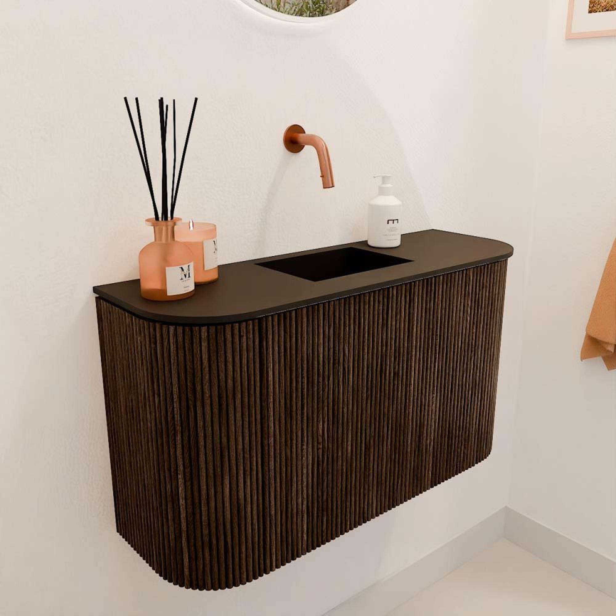 De warme walnootkleur en de verticale ribbelstructuur op de fronten maken dit meubel tot een echte blikvanger. De subtiele rondingen aan de zijkanten zorgen voor een zachte, elegante uitstraling die perfect past in zowel moderne als klassieke badkamers. Door het gebruik van massief eikenhout voor de fronten en eikenfineer voor de zijpanelen straalt het meubel natuurlijke luxe uit. Dit stijlvolle ontwerp tilt jouw badkamer naar een hoger niveau en zorgt voor een tijdloze sfeer waar je elke dag van geniet.