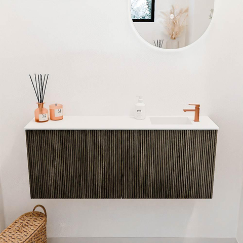 Het meubel valt direct op door het gebruik van hoogwaardig eikenhout met een verticale ribbelstructuur op de fronten. Deze natuurlijke materialen en de donkere Shadow-kleur geven het geheel een warme, luxe uitstraling die perfect past in een moderne badkamer. De subtiele details maken het meubel tot een echte blikvanger, zonder te overheersen. Zo creëer je een tijdloze sfeer waarin je je elke dag weer prettig voelt. De lichte wastafel in Talc-kleur vormt een mooi contrast en versterkt het stijlvolle karakter van het meubel.