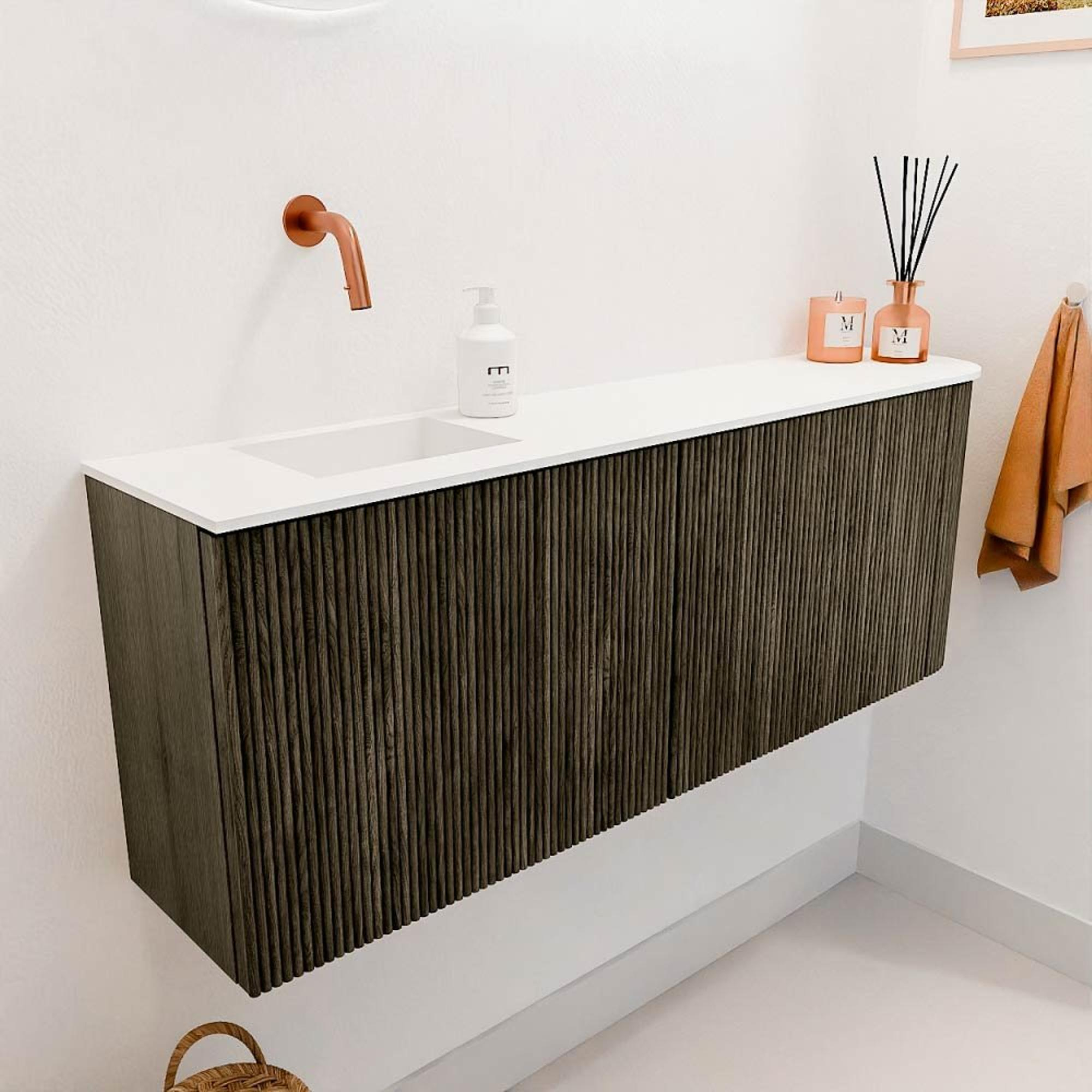 De strakke lijnen en de subtiele ronding aan de rechterkant geven dit meubel een unieke en moderne uitstraling. De combinatie van de diepe Shadow-kleur met het zachte Talc van de wastafel zorgt voor een tijdloze en elegante look. Dankzij het ribbelpatroon op de deuren krijgt het meubel een extra dimensie, wat het design speels en toch verfijnd maakt. Zo voeg je niet alleen functionaliteit toe, maar ook een echte eyecatcher die jouw badkamer een luxe uitstraling geeft. Dit meubel past perfect in diverse interieurstijlen, van modern tot Scandinavisch, en tilt jouw badkamer naar een hoger niveau.