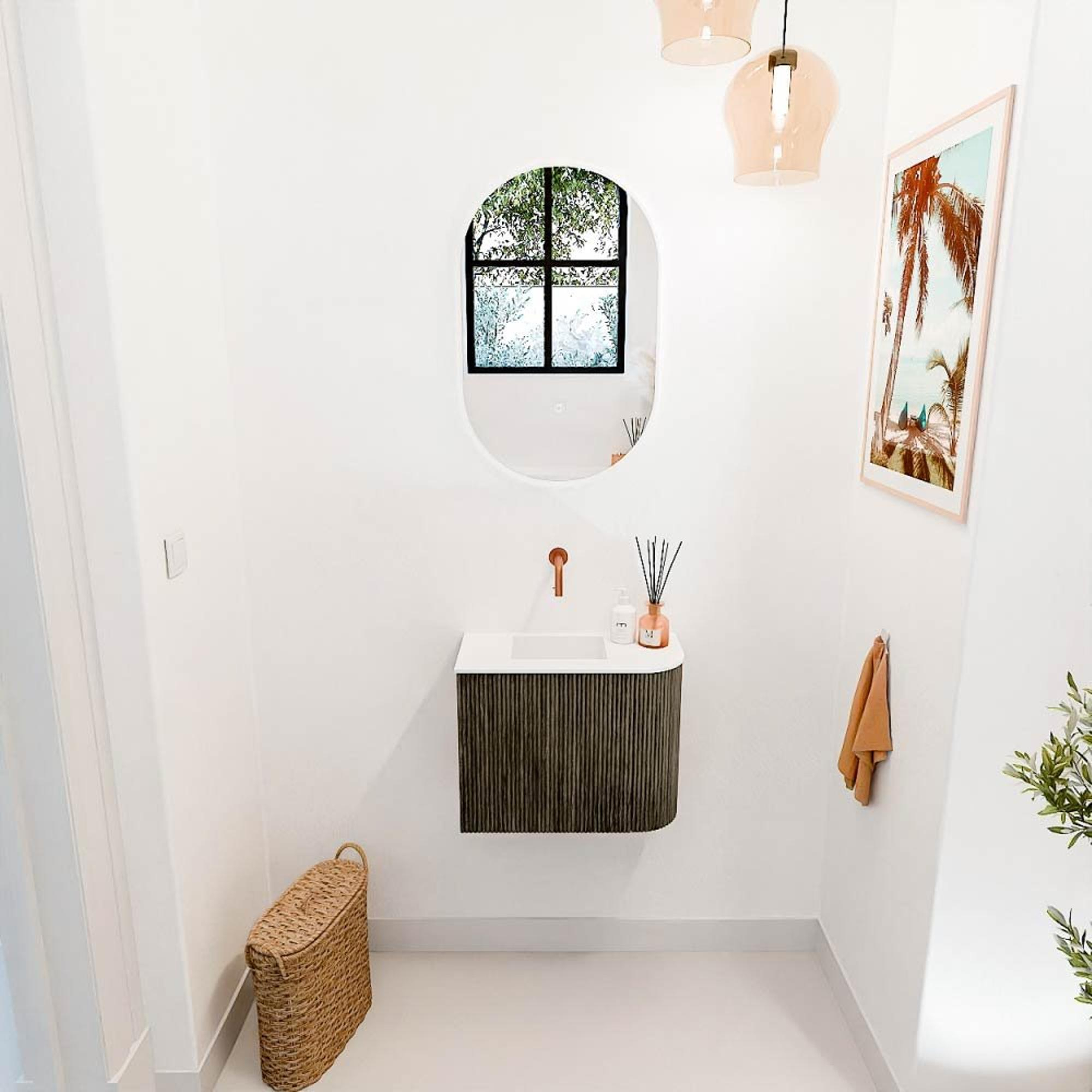 Met dit prachtige meubel geef je jouw toilet of kleine badkamer direct een stijlvolle en functionele upgrade. Het compacte formaat van 51,6 cm breed maakt het ideaal voor ruimtes waar je slim met de beschikbare ruimte wilt omgaan. De combinatie van een strak vormgegeven kast in de diepe, matte kleur Shadow en een elegant gevormde wastafel in zacht Talc zorgt voor een subtiele maar luxe uitstraling. Dankzij de ronde afwerking aan de rechterkant en de wastafel die links gepositioneerd is, sluit het meubel perfect aan op jouw persoonlijke indeling. De wastafel is vervaardigd uit hoogwaardig Solid Surface, wat niet alleen zorgt voor een naadloze afwerking maar ook eenvoudig schoon te houden is. Dit meubel brengt rust en orde in je badkamer dankzij de praktische opbergruimte achter de ribbelige fronten, waar je al je toiletartikelen netjes kunt opbergen. Zo geniet je elke dag van een opgeruimde en sfeervolle ruimte die uitnodigt tot ontspanning en gemak.