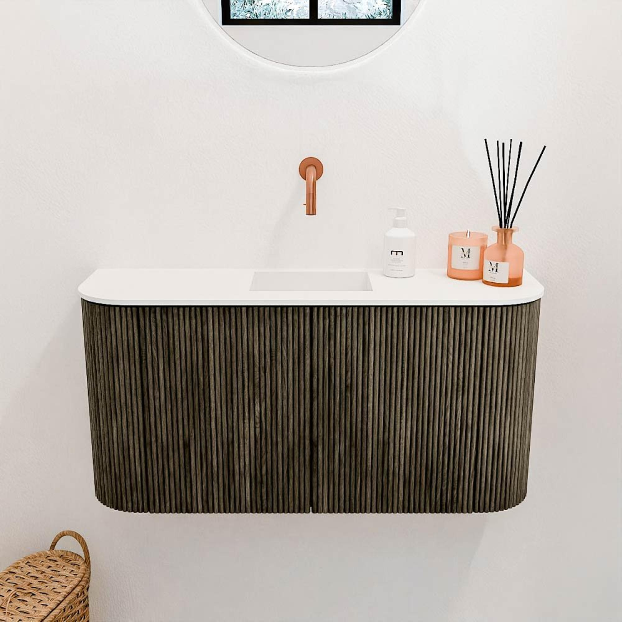 Met zijn elegante ribbelfront en de unieke combinatie van de kleur Shadow voor het meubel en Talc voor de wastafel, is dit meubel een toonbeeld van stijlvol design. De afgeronde randen aan beide zijden zorgen voor een zachte, moderne look die perfect past in zowel strakke als warme badkamerinterieurs. Door de subtiele details en het gebruik van natuurlijke houttinten straalt het meubel een rustige en verfijnde sfeer uit. Zo creëer je een badkamer die niet alleen functioneel is, maar ook een plek waar je graag tijd doorbrengt.