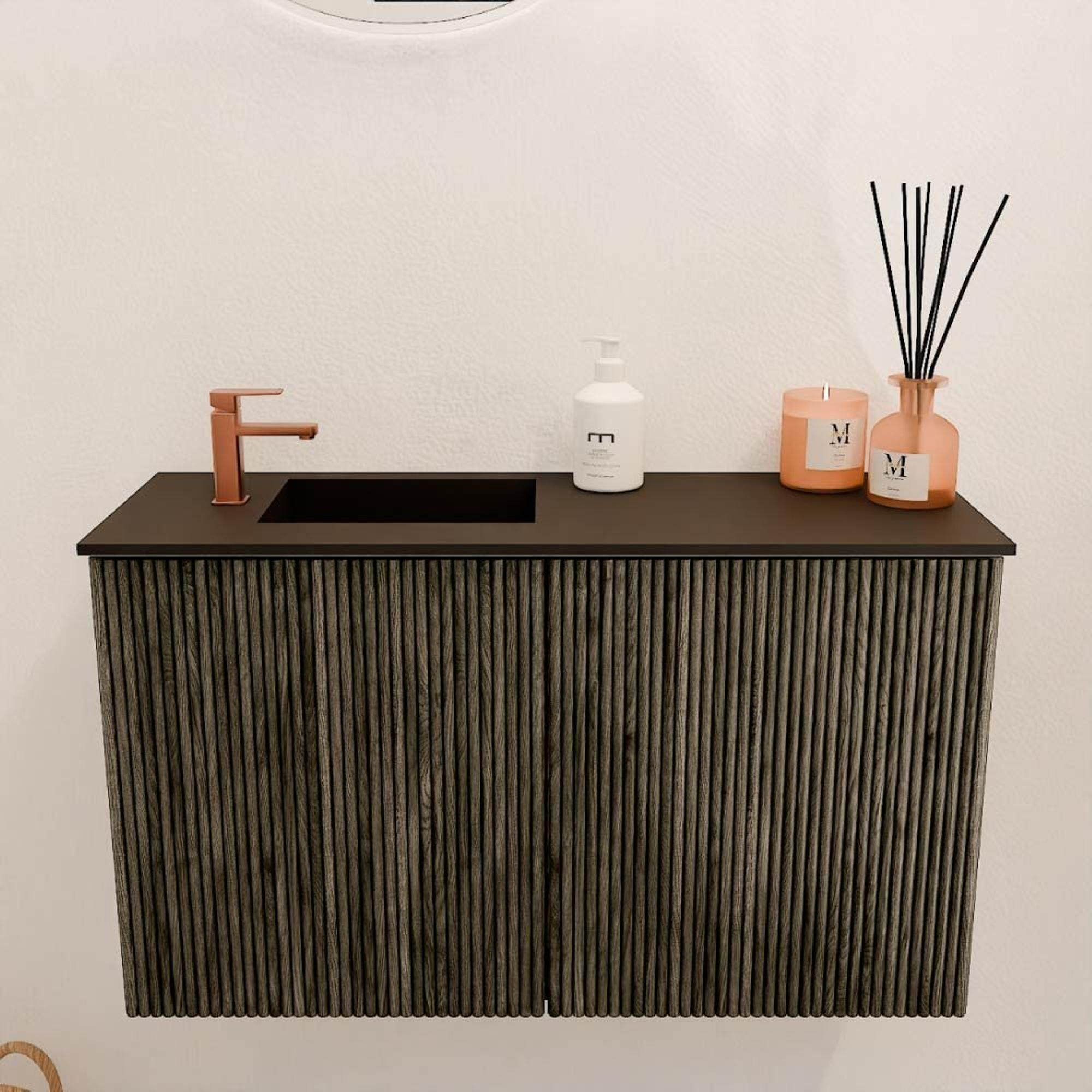 De combinatie van massief eikenhout aan de voorkant en eikenfineer aan de zijkanten geeft het meubel een natuurlijke en luxe uitstraling. De kleur Shadow zorgt voor een warme, diepe tint die perfect aansluit bij moderne en klassieke badkamers. Dit meubel is ontworpen met oog voor detail en vakmanschap, waardoor het een echte eyecatcher wordt in jouw badkamer. Door de subtiele ribbelfronten krijgt het meubel een speels en toch elegant karakter. Zo voeg je moeiteloos stijl toe zonder dat het overheerst.