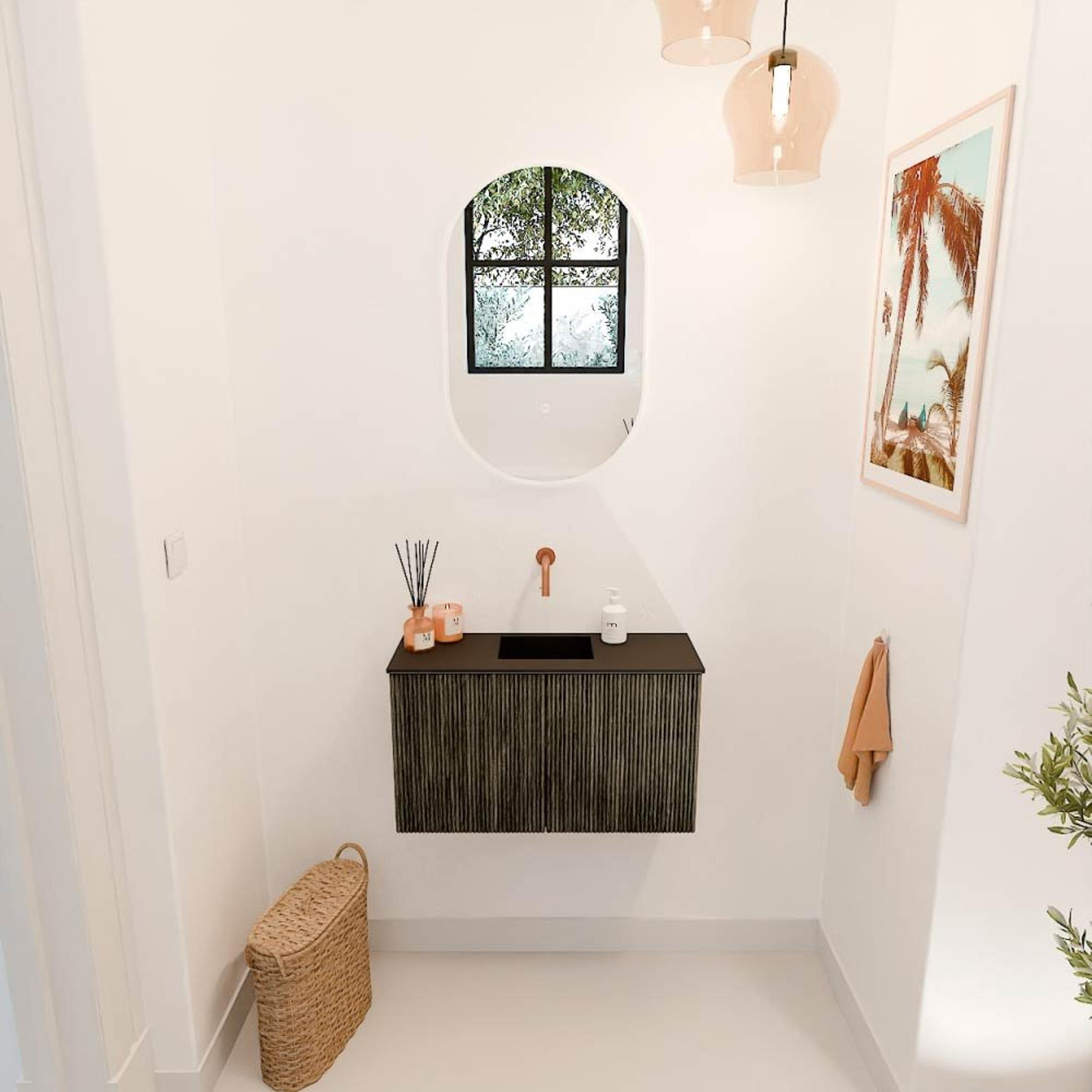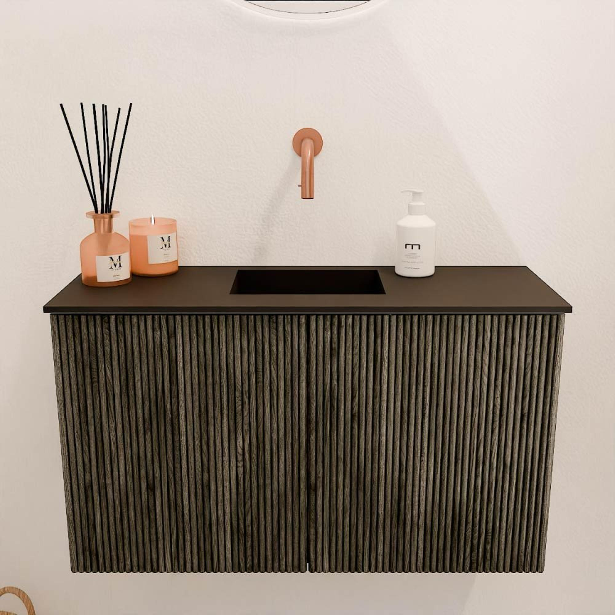 Met dit prachtige meubel geef je jouw badkamer of toiletruimte direct een stijlvolle en moderne upgrade. Het compacte formaat van 70 cm breed maakt het ideaal voor kleinere ruimtes, zonder in te leveren op functionaliteit of uitstraling. De combinatie van de diepe schaduwkleur en het subtiele ribbelpatroon op de fronten zorgt voor een eigentijdse en sfeervolle ambiance. Dankzij de centraal geplaatste wastafel zonder kraangat creëer je een strakke en minimalistische look, die perfect aansluit bij diverse interieurstijlen. Dit meubel is niet alleen een lust voor het oog, maar ook uiterst praktisch: de wandmontage zorgt voor een ruimtelijk gevoel en maakt schoonmaken een stuk eenvoudiger. Zo geniet je elke dag van een badkamer die niet alleen mooi oogt, maar ook prettig in gebruik is.