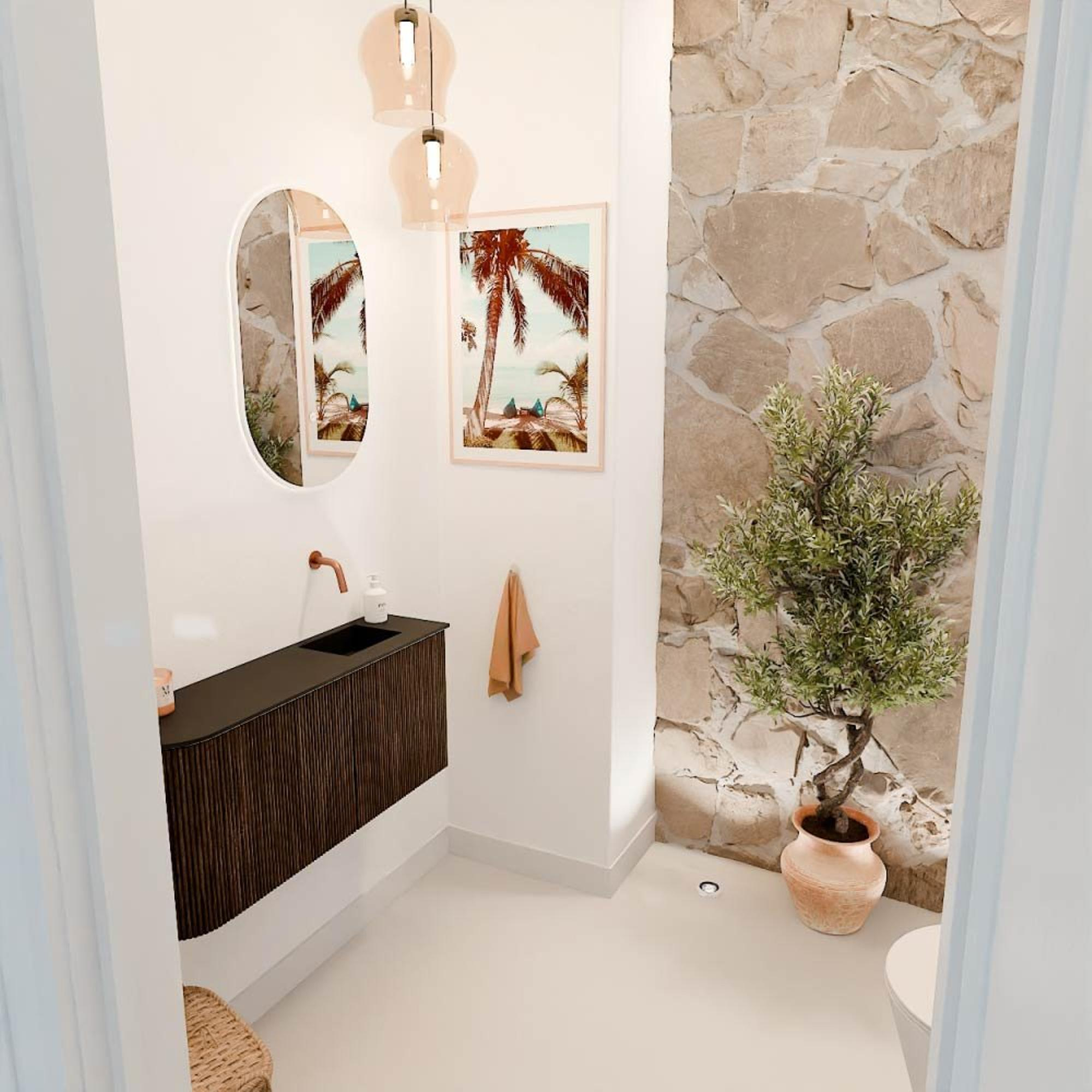 Met dit prachtige meubel geef je jouw badkamer of gastentoilet direct een warme en stijlvolle uitstraling. De combinatie van een natuurlijk walnootfineer en een strak design zorgt voor een tijdloos geheel dat zowel praktisch als elegant is. Dankzij de slimme ronding aan de linkerkant en de wastafel aan de rechterzijde benut je de ruimte optimaal, wat vooral in kleinere badkamers of toiletten een groot voordeel is. Het meubel is ontworpen om niet alleen mooi te zijn, maar ook functioneel: je hebt voldoende opbergruimte om alles netjes uit het zicht te houden, terwijl de wastafel zonder kraangat je de vrijheid geeft om een kraan naar keuze te plaatsen. Zo creëer je een persoonlijke touch die perfect aansluit bij jouw stijl en wensen. Dit meubel is een echte blikvanger die jouw badkamer transformeert tot een plek waar je elke dag met plezier begint en eindigt.
