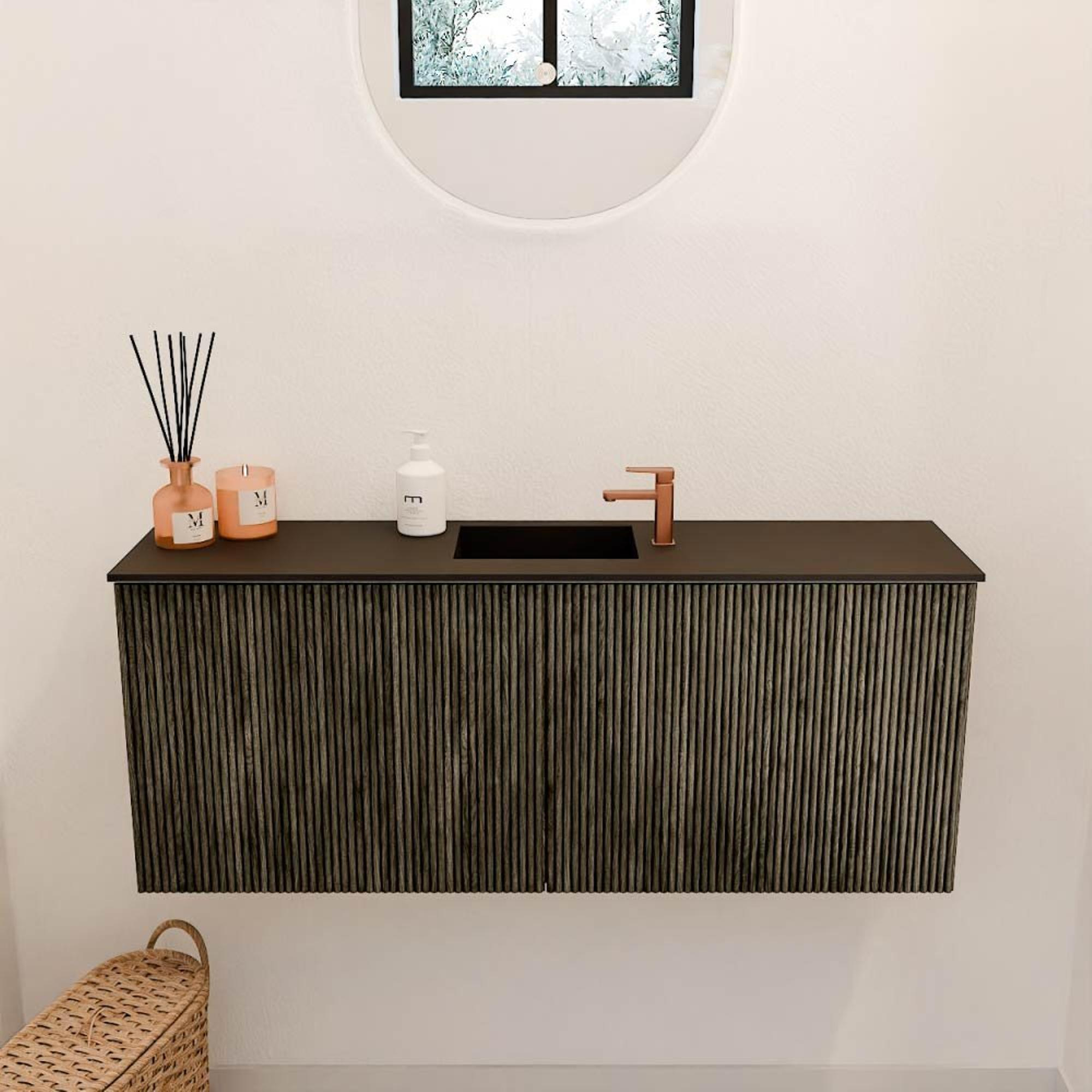 De ribbelige frontpanelen van massief eikenhout geven het meubel een unieke, natuurlijke uitstraling die direct in het oog springt. De warme kleur Shadow versterkt dit effect en zorgt voor een tijdloze elegantie die nooit uit de mode raakt. Dit meubel is niet zomaar functioneel; het is een echte blikvanger die jouw badkamer een luxe en uitnodigende sfeer geeft. Door te kiezen voor dit meubel kies je voor een stijlvol element dat moeiteloos combineert met verschillende interieurstijlen, van modern tot klassiek.