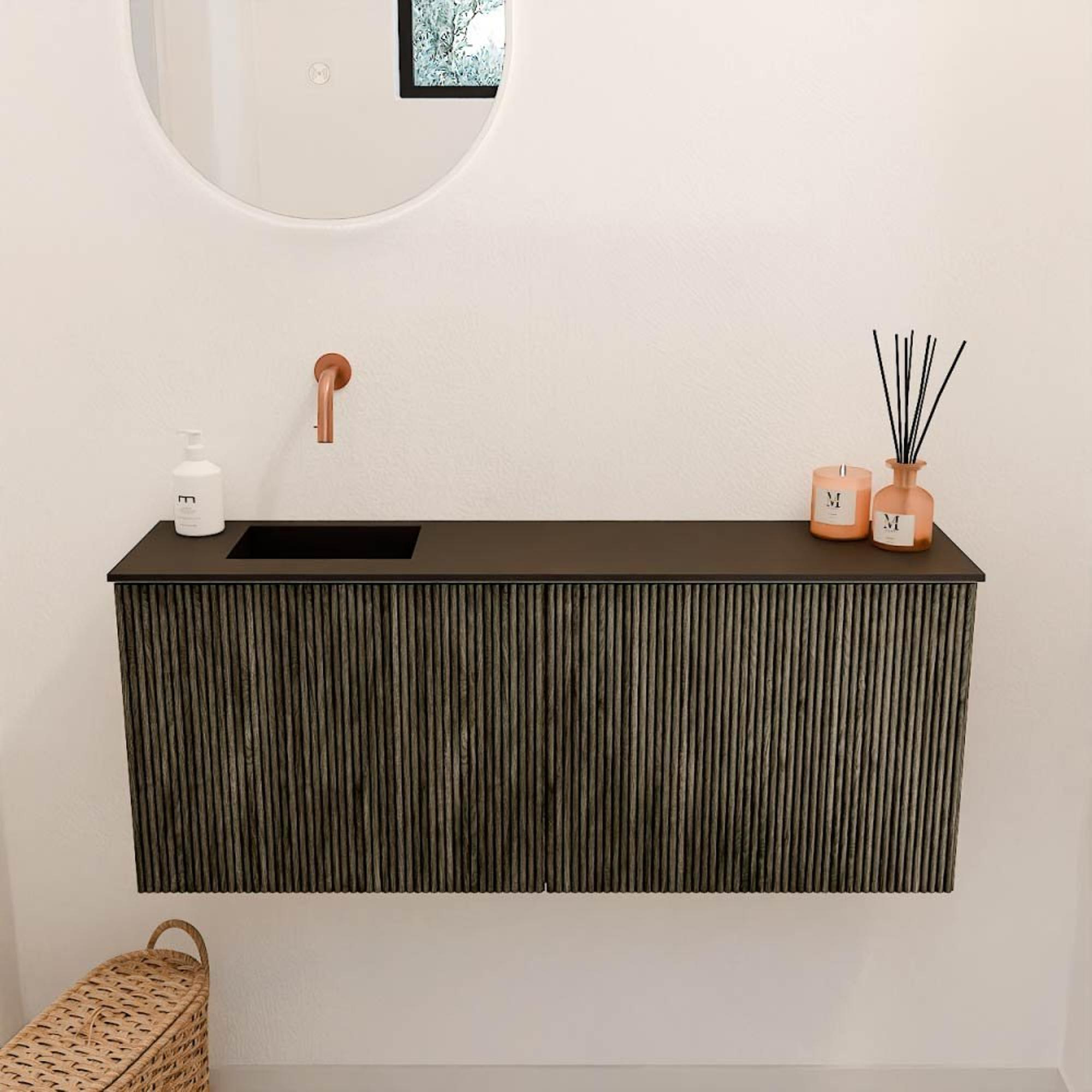 De combinatie van massief eikenhout en eikenfineer in een diepe schaduwkleur geeft het meubel een luxe en natuurlijke uitstraling. De verticale ribben op de frontpanelen zorgen voor een uniek design dat zowel modern als tijdloos oogt. Dit meubel tilt de sfeer van je badkamer naar een hoger niveau en past moeiteloos bij verschillende interieurstijlen. Door de subtiele kleur en het hoogwaardige materiaalgebruik voelt het meubel warm en uitnodigend aan, wat bijdraagt aan een ontspannen badkamerbeleving.