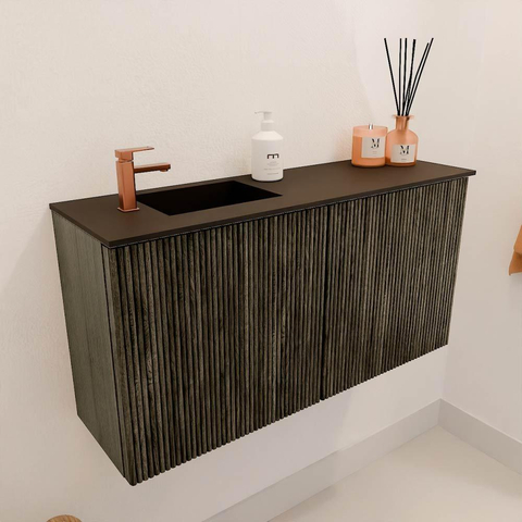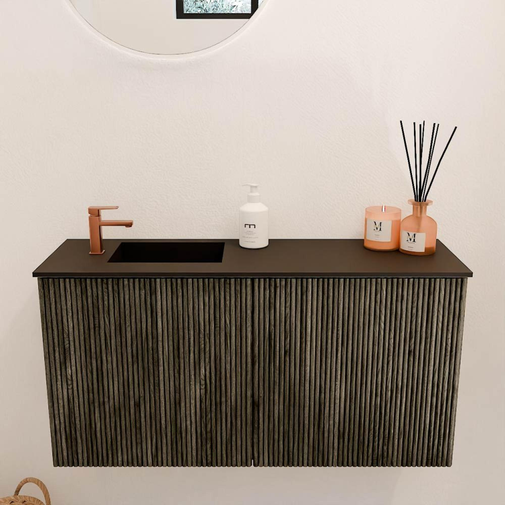 De subtiele ribbelstructuur op de fronten geeft het meubel een moderne en verfijnde uitstraling die moeiteloos aansluit bij diverse interieurstijlen. De warme kleur Shadow in combinatie met het gebruik van massief eikenhout aan de voorkant en eikenfineer aan de zijkanten zorgt voor een natuurlijke en luxe uitstraling. Zo voeg je een tijdloos element toe aan je badkamer dat niet alleen mooi is om te zien, maar ook een gevoel van rust en comfort creëert. Dankzij het doordachte design wordt jouw badkamer een echte blikvanger.