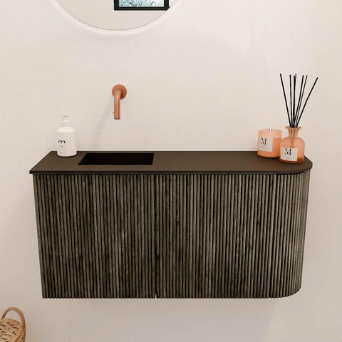 Met dit prachtige meubel geef je jouw badkamer een stijlvolle en natuurlijke uitstraling. Het combineert de warme charme van massief eikenhout met de verfijnde afwerking van eikenfineer, wat zorgt voor een tijdloos en luxe gevoel. Dankzij het doordachte ontwerp met verticale ribbels op het front krijgt jouw badkamer een unieke touch die zowel modern als elegant oogt. Het meubel is perfect voor wandmontage, waardoor je ruimte bespaart en een luchtige sfeer creëert. De wastafel is slim gepositioneerd aan de linkerkant, zonder kraangat, zodat je zelf de kraan kunt kiezen die het beste bij jouw stijl en wensen past. Dit meubel is niet alleen een praktische toevoeging, maar ook een echte blikvanger die jouw badkamer transformeert tot een plek waar je elke dag met plezier begint en eindigt.