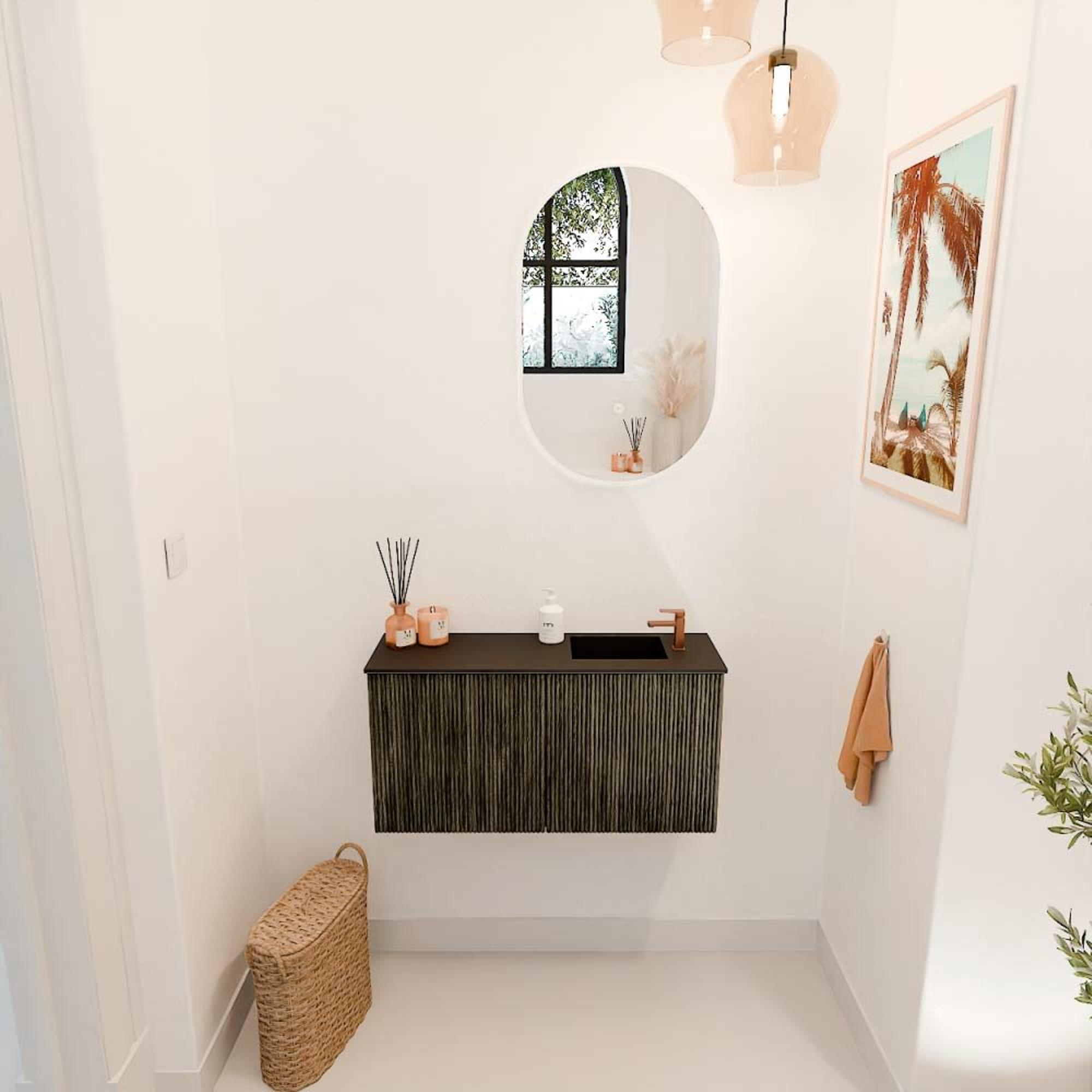 Het meubel valt direct op door de elegante ribbelstructuur aan de voorkant, vervaardigd uit massief eikenhout. De warme Shadow-kleur geeft een natuurlijke en tijdloze uitstraling die moeiteloos aansluit bij diverse interieurstijlen. Door de combinatie met de Urban-kleurige wastafel ontstaat een fraai contrast dat jouw badkamer een moderne en toch uitnodigende sfeer geeft. Dit meubel is niet alleen een functioneel element, maar ook een echte blikvanger die jouw badkamer een luxe uitstraling geeft.