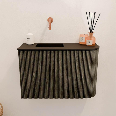 Het meubel valt direct op door zijn verfijnde design en hoogwaardige afwerking. De fronten van massief eikenhout en de zijkanten met eikenfineer geven het geheel een natuurlijke en luxe uitstraling. De verticale ribbelstructuur voegt een speels doch elegant detail toe, waardoor het meubel een echte blikvanger wordt in jouw badkamer. De donkere Shadow-kleur versterkt de moderne uitstraling en zorgt voor een warme sfeer. Zo geniet je niet alleen van een praktisch meubel, maar ook van een stijlvol element dat je badkamer compleet maakt.