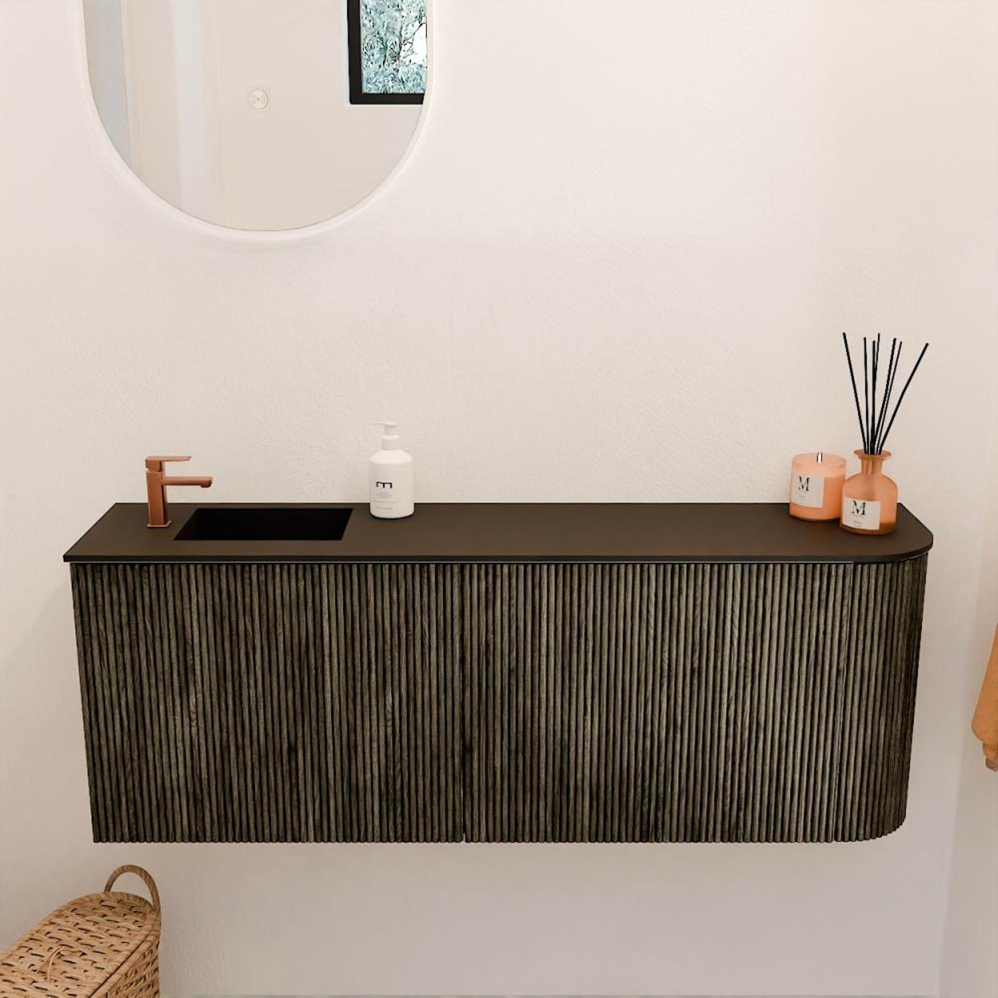 Het meubel valt direct op door zijn moderne en strakke design. De zachte ronding aan de rechterkant geeft het een unieke uitstraling die anders is dan standaard rechthoekige meubels. De kleuren Shadow en Urban zijn zorgvuldig gekozen om een rustige, maar toch eigentijdse sfeer te creëren. Dit zorgt ervoor dat het meubel moeiteloos aansluit bij diverse badkamerstijlen, van minimalistisch tot industrieel. Door de subtiele kleurcontrasten krijgt jouw badkamer een warme en uitnodigende uitstraling, zonder te overheersen. Zo geniet je elke dag van een stijlvolle omgeving die rust en comfort uitstraalt.