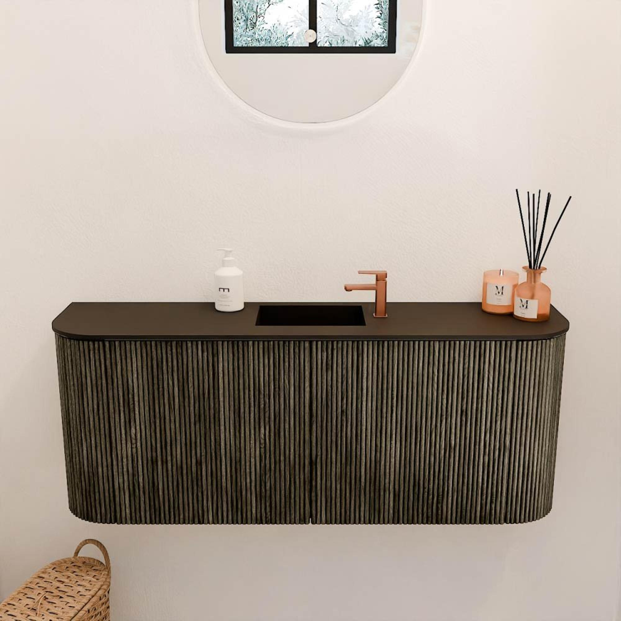 De combinatie van de donkere Shadow-kleur met het ribbelpatroon op de fronten geeft dit meubel een unieke, eigentijdse uitstraling. De subtiele rondingen aan beide zijden maken het ontwerp zachter en vriendelijker, waardoor het meubel een echte blikvanger wordt in jouw badkamer. Dankzij het strakke, moderne design past het moeiteloos in diverse interieurstijlen, van minimalistisch tot industrieel. Zo creëer je een badkamer die niet alleen functioneel is, maar ook stijlvol en uitnodigend aanvoelt.