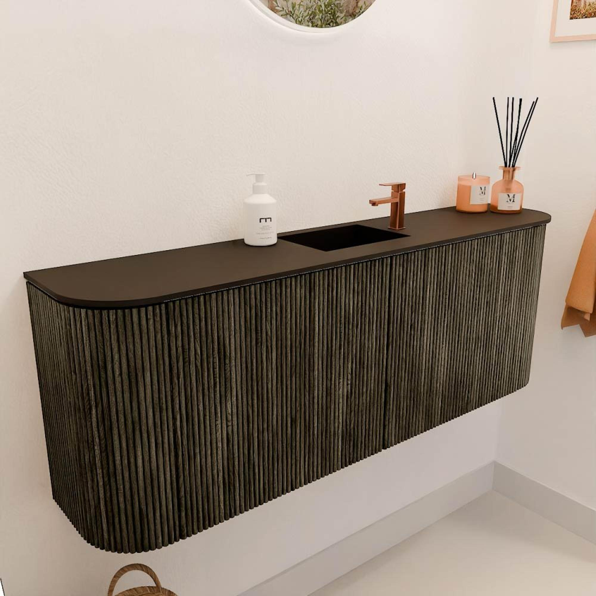 De combinatie van de donkere Shadow-kleur met de natuurlijke uitstraling van massief eikenhout geeft het meubel een tijdloze elegantie. De subtiele rondingen aan beide kanten zorgen voor een uniek en verfijnd design dat direct in het oog springt. Dit meubel is een echte blikvanger die jouw badkamer een luxe en warme sfeer geeft. Door de hoogwaardige afwerking en het gebruik van natuurlijke materialen straalt het niet alleen kwaliteit uit, maar past het ook perfect bij verschillende interieurstijlen, van modern tot klassiek.