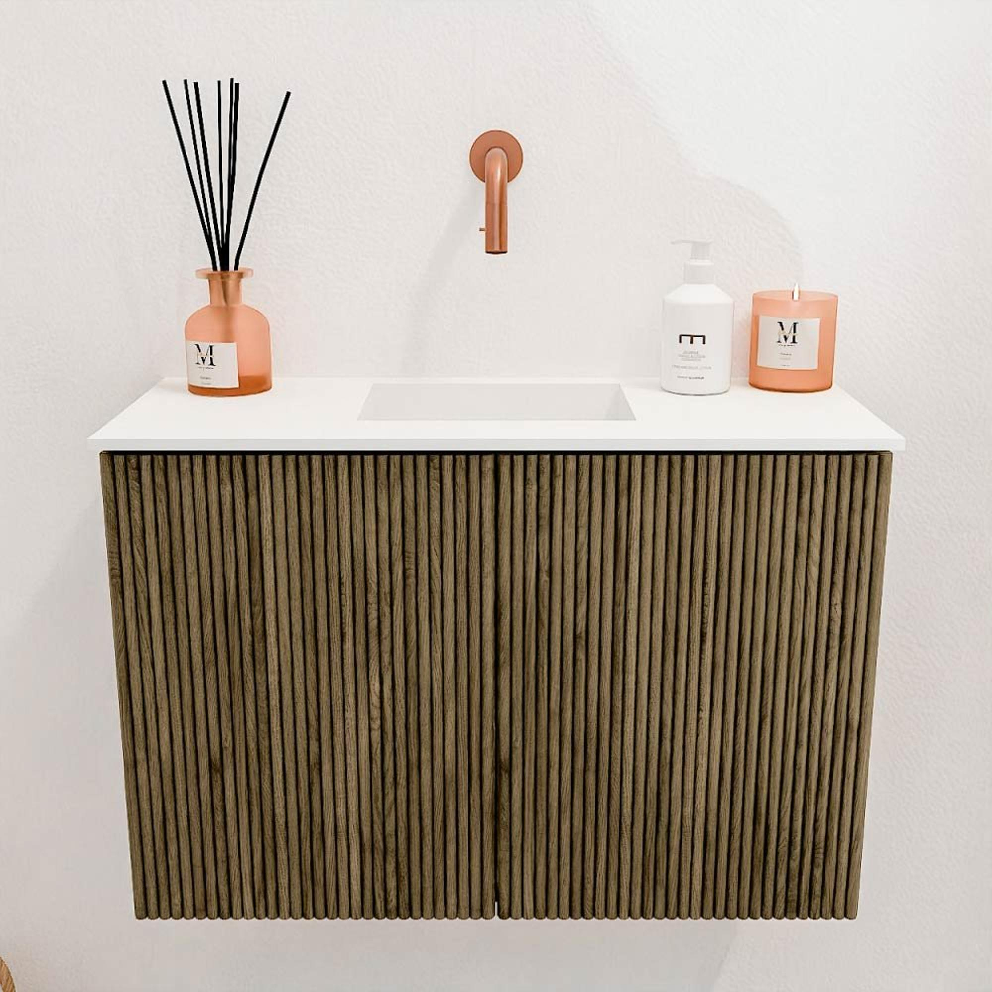 Het meubel valt direct op door zijn verfijnde kleur Dusk, die een warme en uitnodigende sfeer creëert. De ribbelige fronten geven het geheel een unieke textuur en een modern karakter. Deze combinatie van kleur en design zorgt ervoor dat het meubel moeiteloos aansluit bij diverse interieurstijlen, van strak en minimalistisch tot warm en natuurlijk. Zo voeg je niet alleen een functioneel element toe, maar ook een echte eyecatcher die jouw badkamer een persoonlijke touch geeft.