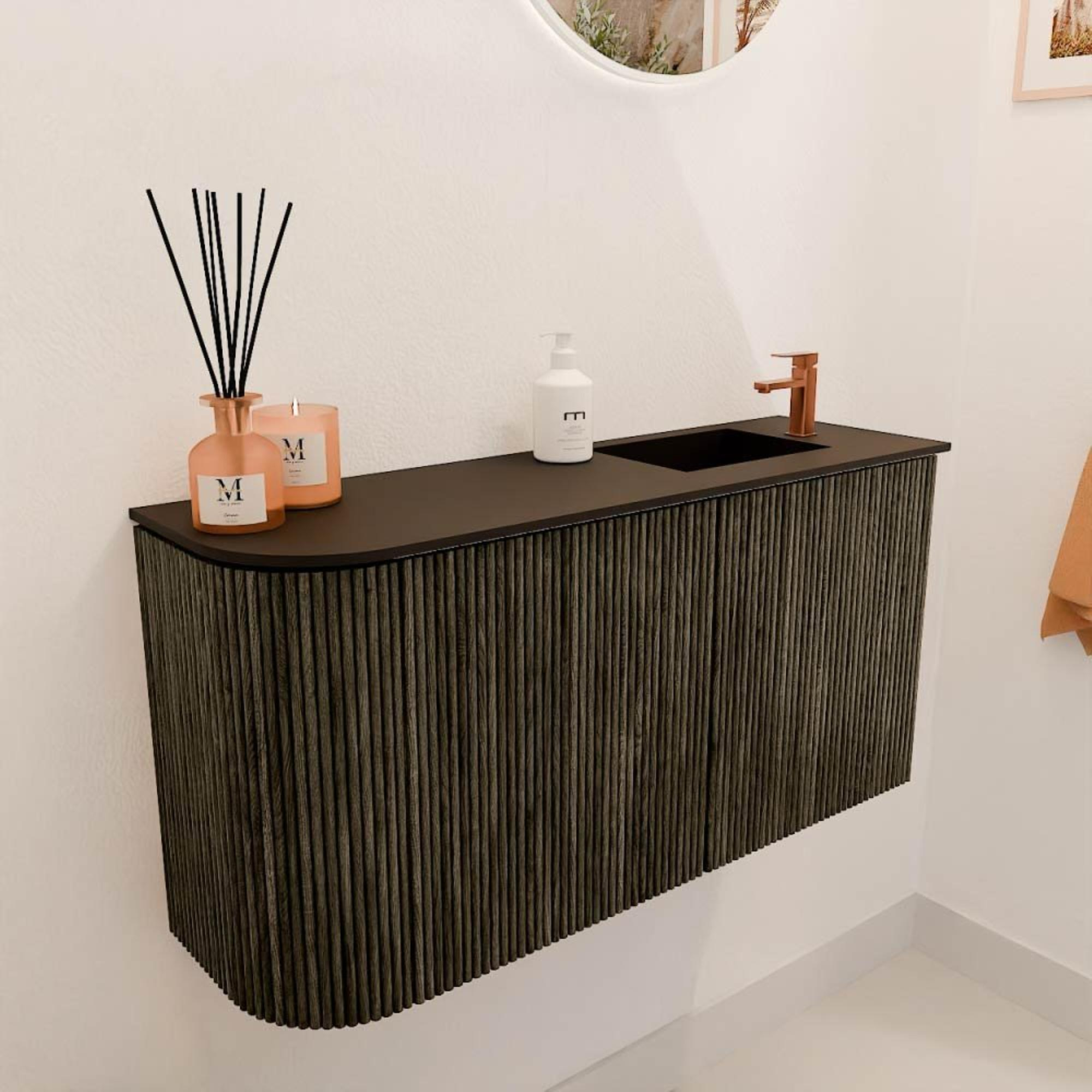De unieke ronding aan de linkerkant geeft het meubel een onderscheidend karakter dat direct opvalt. De combinatie van massief eikenhout aan de voorkant en eikenfineer aan de zijkanten zorgt voor een natuurlijke en luxe uitstraling. De Shadow-kleur voegt een warme, donkere tint toe die elegantie en rust uitstraalt. Zo creëer je een tijdloze sfeer die jouw badkamer direct een upgrade geeft. Dit meubel is niet alleen een functioneel element, maar ook een echte blikvanger die jouw persoonlijke stijl versterkt.