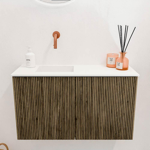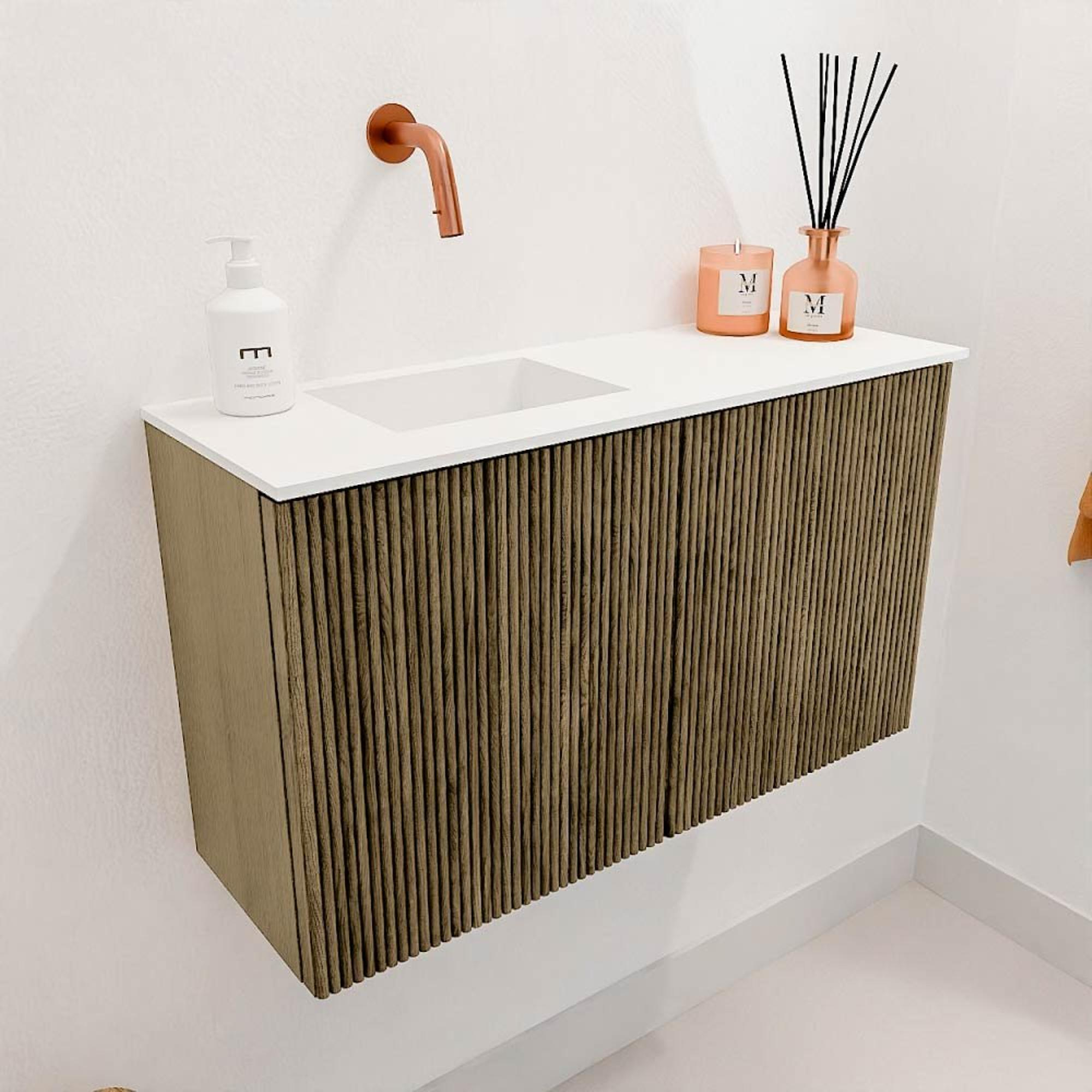 Het meubel valt direct op door het ribbelfront dat een speels en eigentijds accent toevoegt aan je badkamer. De combinatie van de diepe, matte kleur Dusk met de lichte wastafel in Talc zorgt voor een tijdloze uitstraling die moeiteloos aansluit bij diverse interieurstijlen. Dit maakt het meubel niet alleen een functioneel element, maar ook een echte blikvanger. Door het subtiele contrast en de strakke lijnen krijgt jouw badkamer een luxe en verzorgde uitstraling die je gasten zeker zullen waarderen.