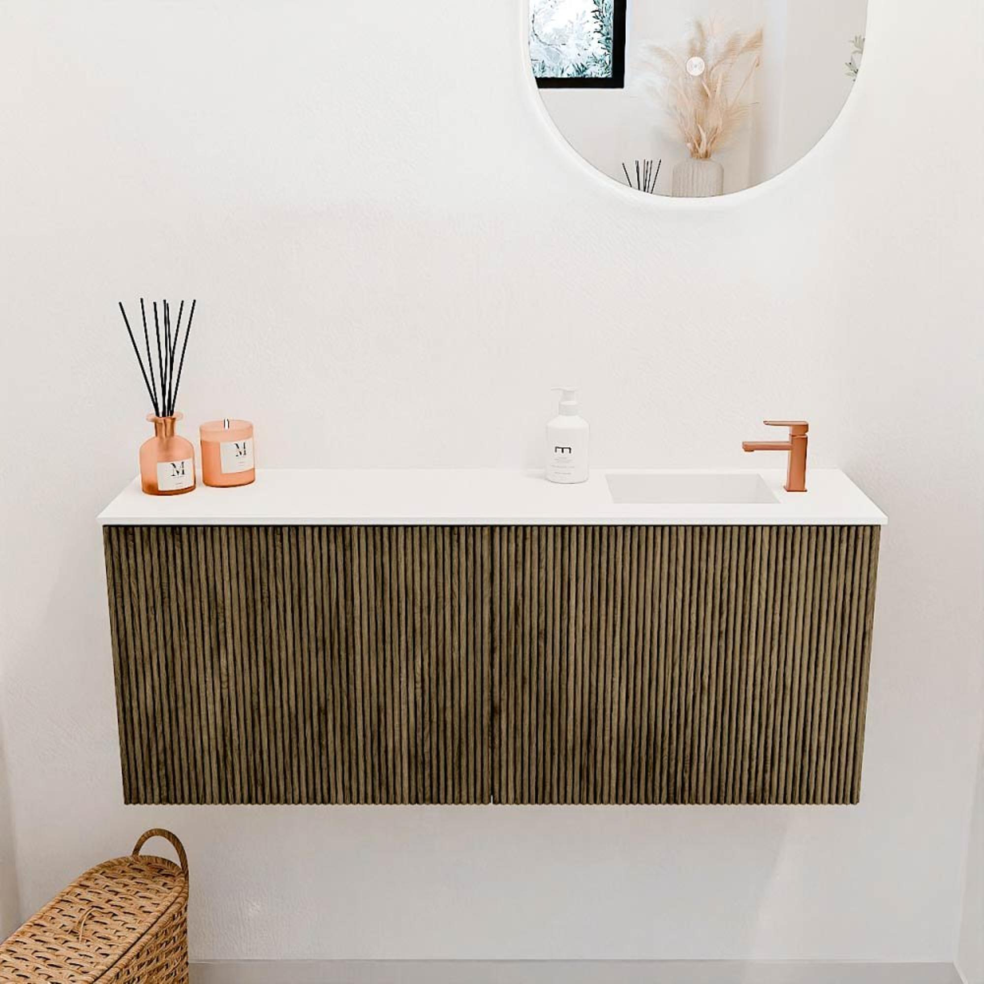 Het meubel valt direct op door het elegante ribbelpatroon op de fronten, dat zorgt voor een moderne en verfijnde uitstraling. De combinatie van de warme Dusk-kleur met het lichte Talc van de wastafel creëert een harmonieus geheel dat moeiteloos in verschillende badkamerstijlen past. Door het gebruik van hoogwaardige materialen zoals massief eikenhout en eikenfineer straalt het meubel niet alleen luxe uit, maar voelt het ook duurzaam en robuust aan. Zo haal je een meubel in huis dat niet alleen vandaag, maar ook over jaren nog steeds prachtig oogt.
