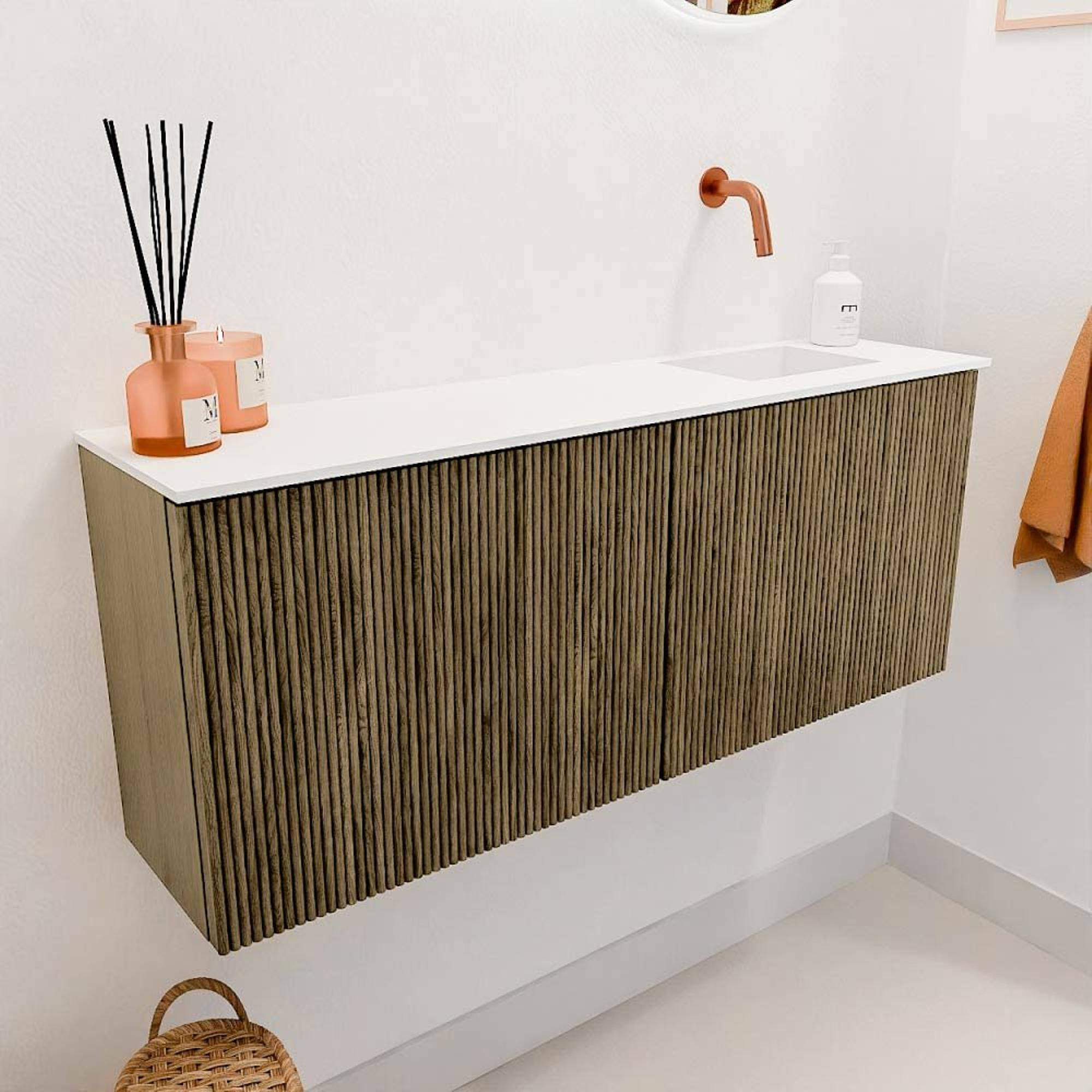 Het meubel valt direct op door het unieke ribbelfront dat een speels maar toch verfijnd effect geeft. De kleur Dusk voegt een zachte, natuurlijke tint toe die moeiteloos combineert met diverse badkamerstijlen. Dankzij het gebruik van massief eikenhout en eikenfineer straalt het meubel een tijdloze elegantie uit. Dit zorgt ervoor dat het niet alleen nu, maar ook over jaren een prachtige toevoeging blijft. Het design is zorgvuldig vormgegeven om een luxe uitstraling te bieden zonder te overheersen, waardoor het meubel perfect in balans is met de rest van je badkamerinrichting.