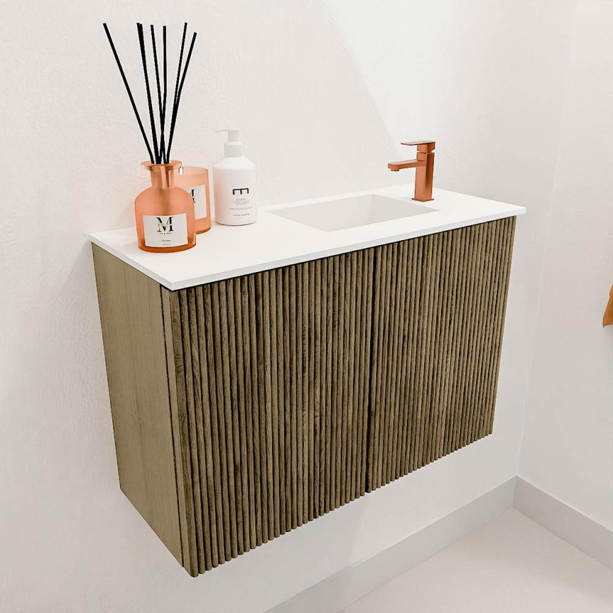 Dit meubel valt direct op door het elegante ribbelfront dat een speels maar toch ingetogen accent geeft aan jouw badkamer. De kleur Dusk, een zachte, natuurlijke tint, past moeiteloos in uiteenlopende interieurstijlen. De wastafel in de kleur Talc voegt een frisse, lichte touch toe die het geheel in balans brengt. Door de verticale ribbels krijgt het meubel een unieke textuur die zowel modern als tijdloos oogt. Zo geniet je van een badkamermeubel dat niet alleen functioneel is, maar ook een echte blikvanger vormt.