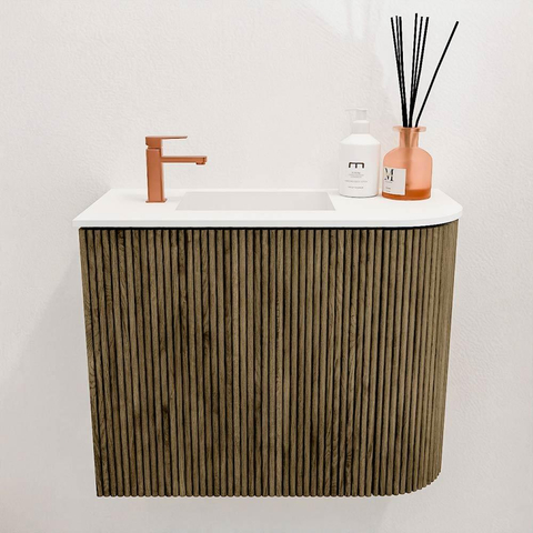 Dit prachtige meubel brengt direct sfeer en stijl in jouw badkamer. Met zijn compacte afmetingen past het perfect in kleinere ruimtes, zonder in te leveren op functionaliteit of uitstraling. Het meubel is ontworpen met oog voor detail en combineert een warme, natuurlijke uitstraling met een eigentijdse vormgeving. Dankzij de subtiele ronding aan de rechterzijde en het unieke ribbelfront krijgt jouw badkamer een chique en moderne touch. De wastafel is slim gepositioneerd aan de linkerzijde, waardoor je optimaal gebruikmaakt van de beschikbare ruimte. Dit meubel verandert jouw badkamer in een plek waar je elke dag met plezier begint en eindigt.
