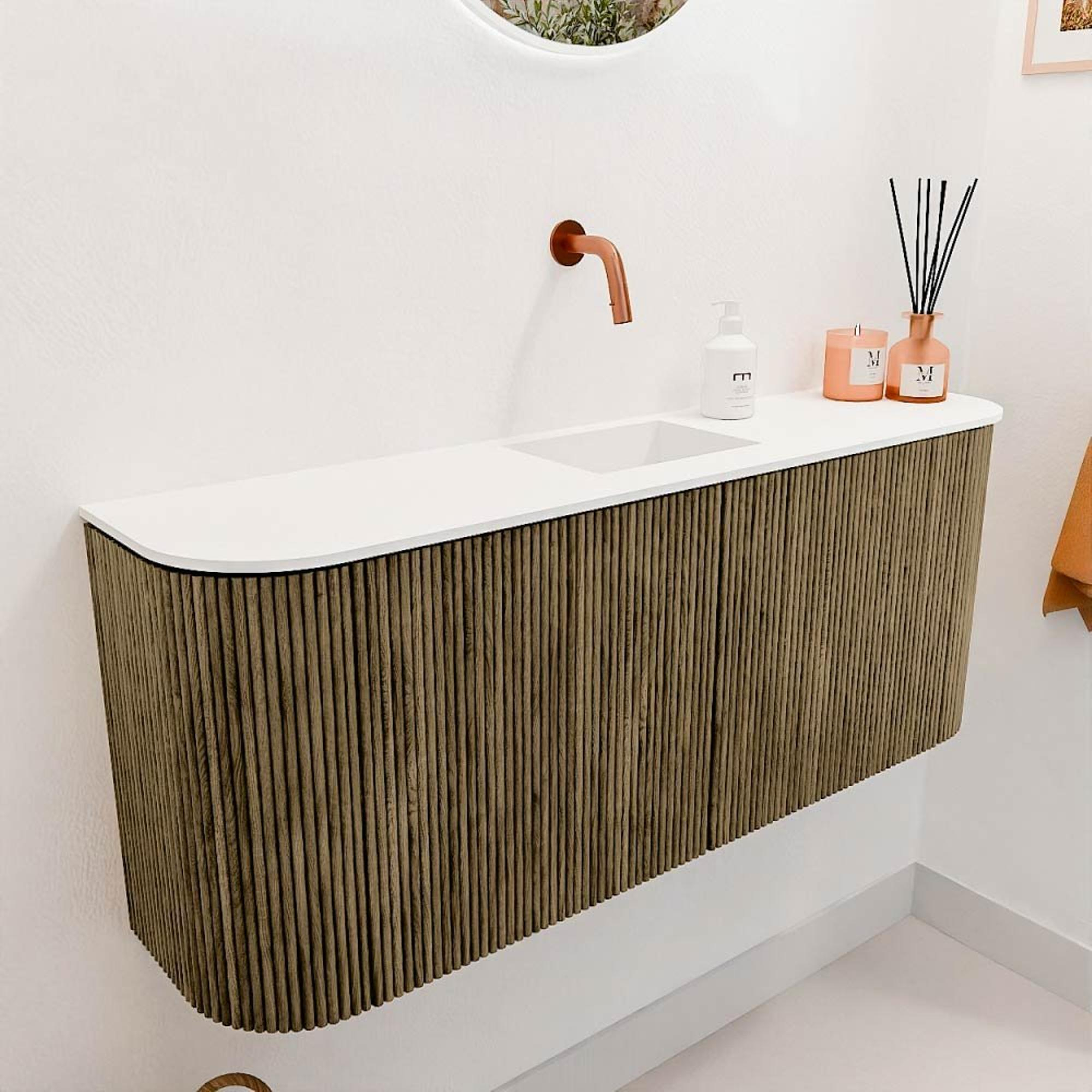 Met dit prachtige meubel geef je jouw badkamer of gastentoilet direct een stijlvolle en moderne uitstraling. Het meubel combineert een warme, diepe kleur met een subtiele ribstructuur die zorgt voor een speels en toch elegant effect. Dankzij de afgeronde hoeken aan beide zijden voelt het meubel niet alleen vriendelijk en uitnodigend aan, maar is het ook veilig in gebruik, ideaal voor gezinnen. De wastafel in een zachte talc-kleur vormt een mooi contrast en is perfect gepositioneerd in het midden, waardoor je optimaal gebruikmaakt van de ruimte. Zonder kraangat kun je zelf kiezen welke kraan het beste bij jouw stijl en wensen past. Dit meubel is niet alleen een lust voor het oog, maar ook praktisch dankzij de slimme indeling en voldoende opbergruimte. Zo houd je jouw badkamer netjes en georganiseerd, wat bijdraagt aan een ontspannen sfeer waarin je elke dag weer met plezier begint.
