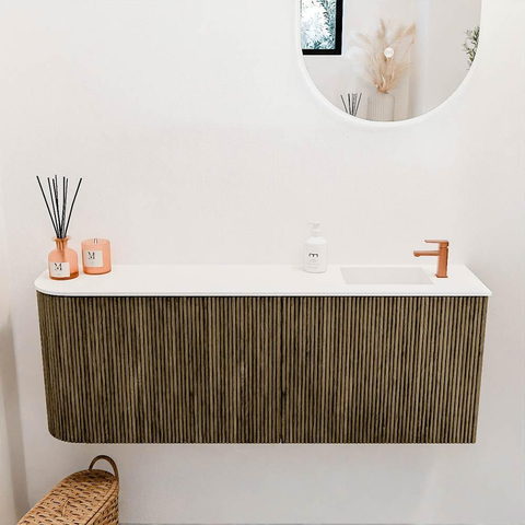 De verticale groeven in het eikenhout geven het meubel een moderne en verfijnde uitstraling die direct in het oog springt. De combinatie van de diepe kleur Dusk met het lichte Talc van de wastafel zorgt voor een subtiel contrast dat rust en elegantie uitstraalt. Dit meubel past perfect in zowel klassieke als eigentijdse badkamers en voegt een vleugje luxe toe zonder te overheersen. Door het doordachte design voelt jouw badkamer meteen compleet en verzorgd aan.