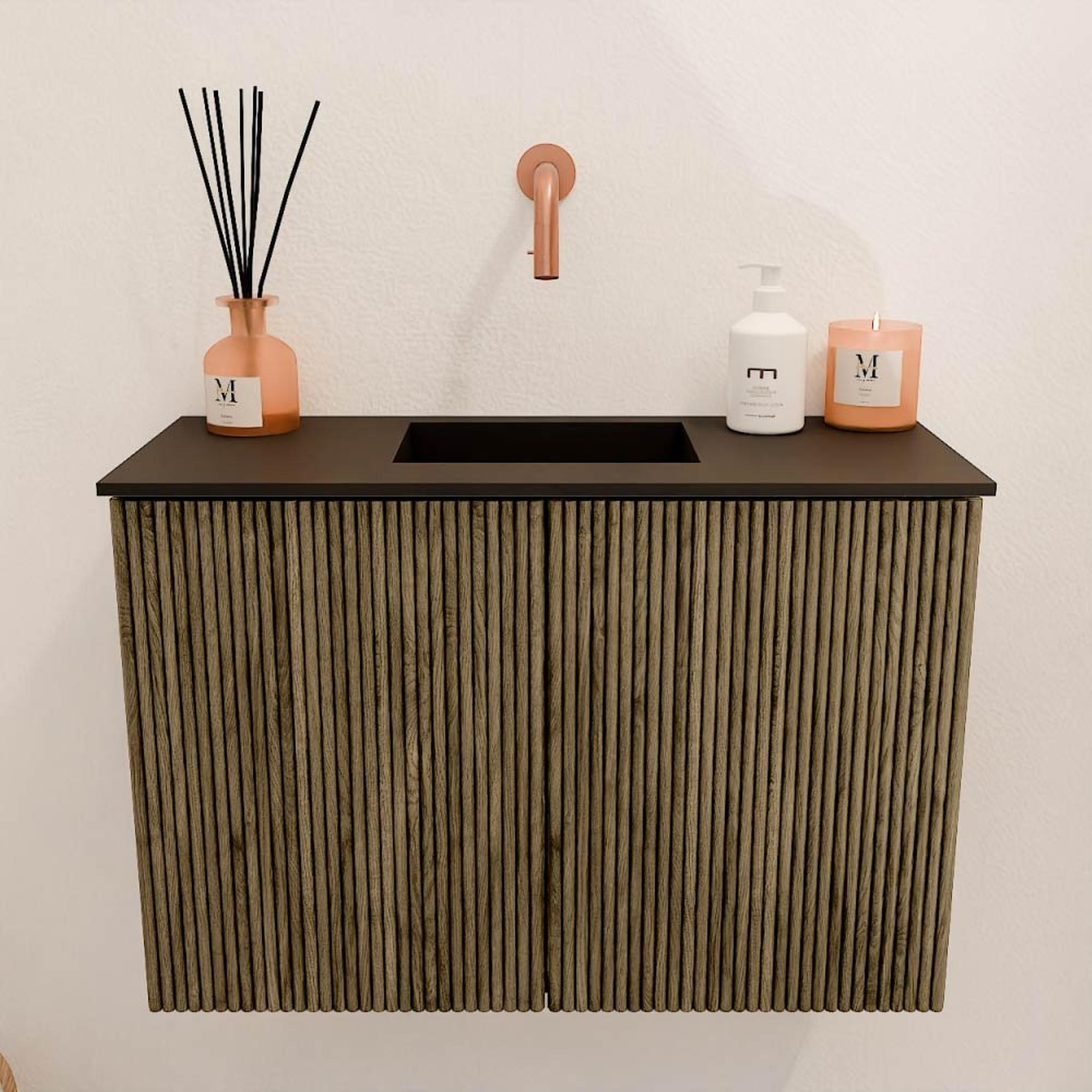 Het meubel valt meteen op door het elegante ribbeldesign dat het front siert. Deze verticale lijnen geven het geheel een moderne en luxe uitstraling die perfect aansluit bij hedendaagse badkamertrends. De warme kleur Dusk, ook wel Urban genoemd, voegt een natuurlijke en rustige sfeer toe, waardoor je badkamer een echte eyecatcher wordt. Dankzij het doordachte ontwerp past het meubel moeiteloos in diverse interieurstijlen, van strak en minimalistisch tot warm en landelijk. Zo geniet je van een stijlvol meubel dat jouw persoonlijke smaak perfect weerspiegelt.