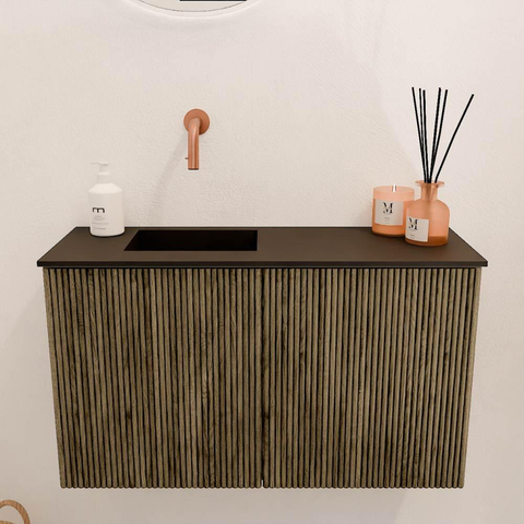 Het meubel valt direct op door zijn verfijnde, geribbelde fronten in een warme Dusk-kleur. Deze unieke afwerking geeft jouw badkamer een moderne en toch natuurlijke uitstraling die moeiteloos combineert met diverse interieurstijlen. De subtiele houtstructuur zorgt voor een authentiek gevoel, waardoor het meubel een echte blikvanger wordt. Door de links geplaatste wastafel krijgt het geheel een speelse asymmetrie die jouw badkamer net dat beetje extra karakter geeft.