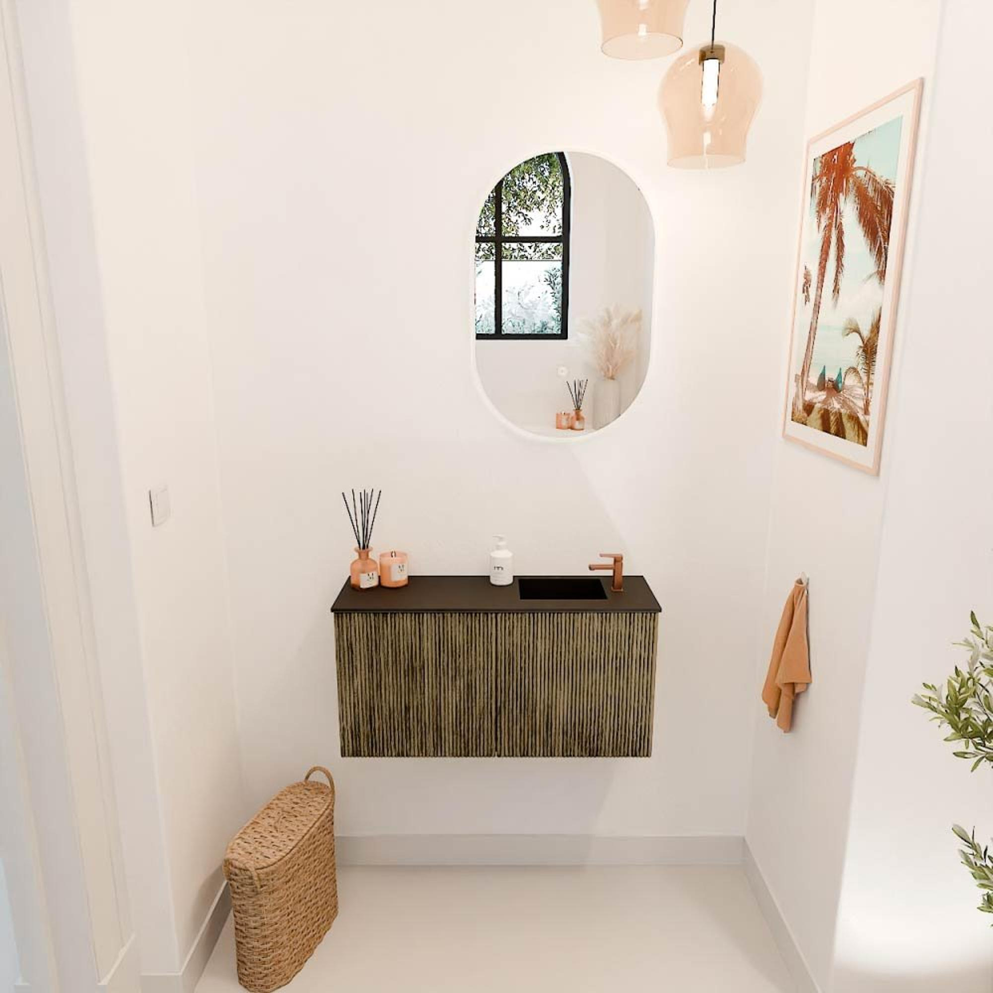 Met zijn donkere Dusk-kleur en natuurlijke houtstructuur brengt dit meubel een warme, tijdloze sfeer in je badkamer. De combinatie met de Urban-kleurige wastafel zorgt voor een modern contrast dat moeiteloos aansluit bij diverse interieurstijlen. Dit meubel is niet zomaar functioneel, het is een echte blikvanger die jouw badkamer een luxe uitstraling geeft. Door het subtiele design en de hoogwaardige afwerking voelt de ruimte direct uitnodigend en verzorgd aan.