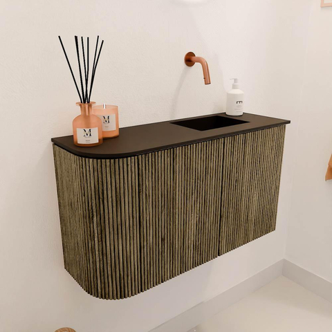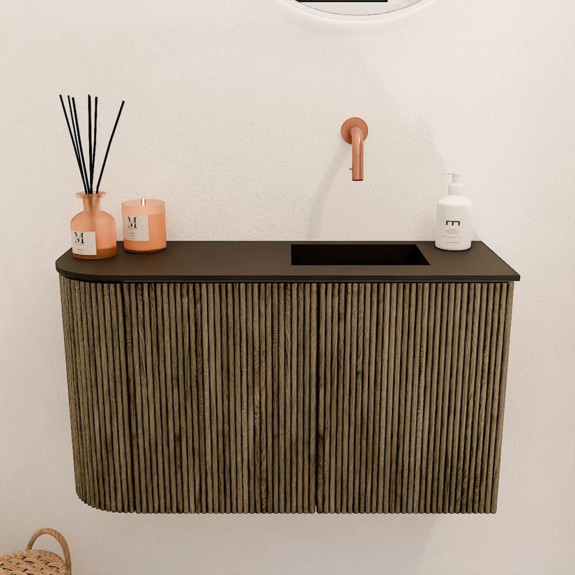 De verticale groeven in het massief eikenhout geven het meubel een unieke, moderne uitstraling die toch tijdloos blijft. De combinatie van de warme houttinten met de strakke lijnen zorgt voor een harmonieus geheel dat in vrijwel elke badkamer past. Door de subtiele ronding aan de linkerkant krijgt het meubel een speels accent, wat het design net dat beetje extra karakter geeft. Zo voeg je moeiteloos een stijlvol element toe aan jouw badkamerinterieur.