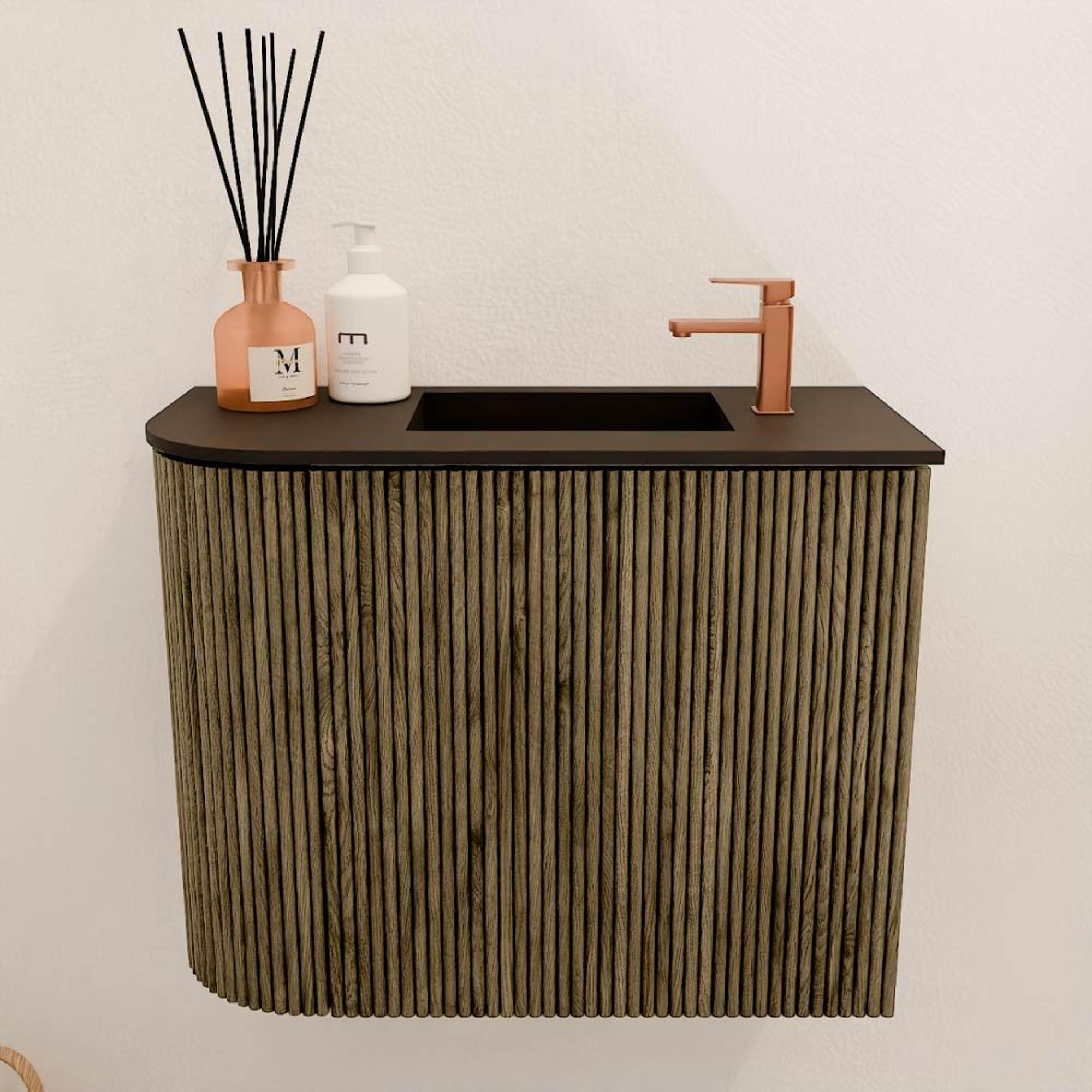 Het ontwerp van dit meubel straalt tijdloze elegantie uit. De combinatie van massief eikenhout en eiken fineer met verticale ribbels geeft het een natuurlijke en luxe uitstraling die moeiteloos in diverse interieurstijlen past. De kleur Dusk zorgt voor een warme, rustige sfeer die uitnodigt tot ontspanning. Door de subtiele ronding aan de linkerkant krijgt het meubel een uniek karakter, waardoor het niet alleen functioneel is, maar ook een echte eyecatcher in je badkamer. Zo creëer je een ruimte die niet alleen praktisch is, maar ook visueel aanspreekt.