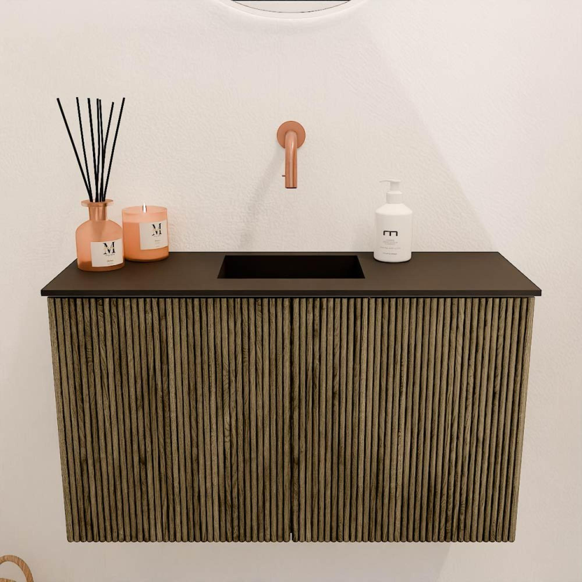 Het meubel valt direct op door het verfijnde ontwerp met verticale ribbels, die niet alleen een speels effect geven, maar ook zorgen voor een luxe uitstraling. De kleur Dusk, een warme, natuurlijke tint, versterkt de elegante sfeer en past moeiteloos bij verschillende badkamerstijlen. Dankzij het tijdloze design blijft het meubel jarenlang een blikvanger, zonder snel uit de mode te raken. Zo investeer je in een stijlvol element dat jouw badkamer een unieke uitstraling geeft.
