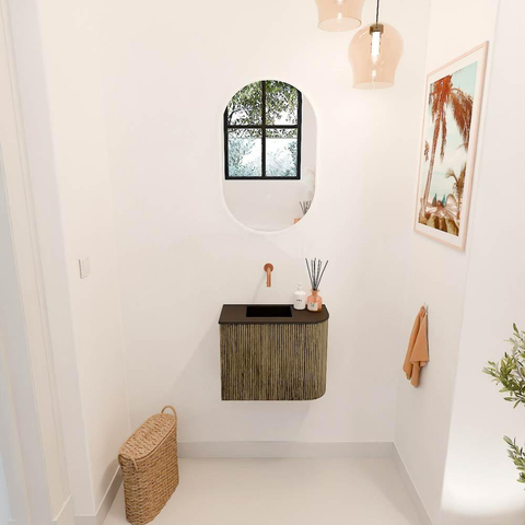 Met dit prachtige meubel geef je jouw badkamer direct een stijlvolle en moderne upgrade. Het compacte ontwerp met een breedte van 51,6 cm past perfect in kleinere ruimtes zonder in te leveren op functionaliteit. De subtiele ronding aan de rechterkant zorgt voor een speels en elegant accent, terwijl de warme kleur Dusk een rustige en uitnodigende sfeer creëert. Dankzij de hoogwaardige materialen, waaronder massief eikenhout en eikenfineer, geniet je niet alleen van een fraai uiterlijk, maar ook van duurzaamheid en kwaliteit die jarenlang meegaan. De wastafel is links gepositioneerd en zonder kraangat, zodat je zelf de perfecte kraan kunt kiezen die past bij jouw wensen en stijl. Dit meubel maakt het eenvoudig om jouw badkamer te transformeren tot een plek waar je elke dag met plezier begint en eindigt.