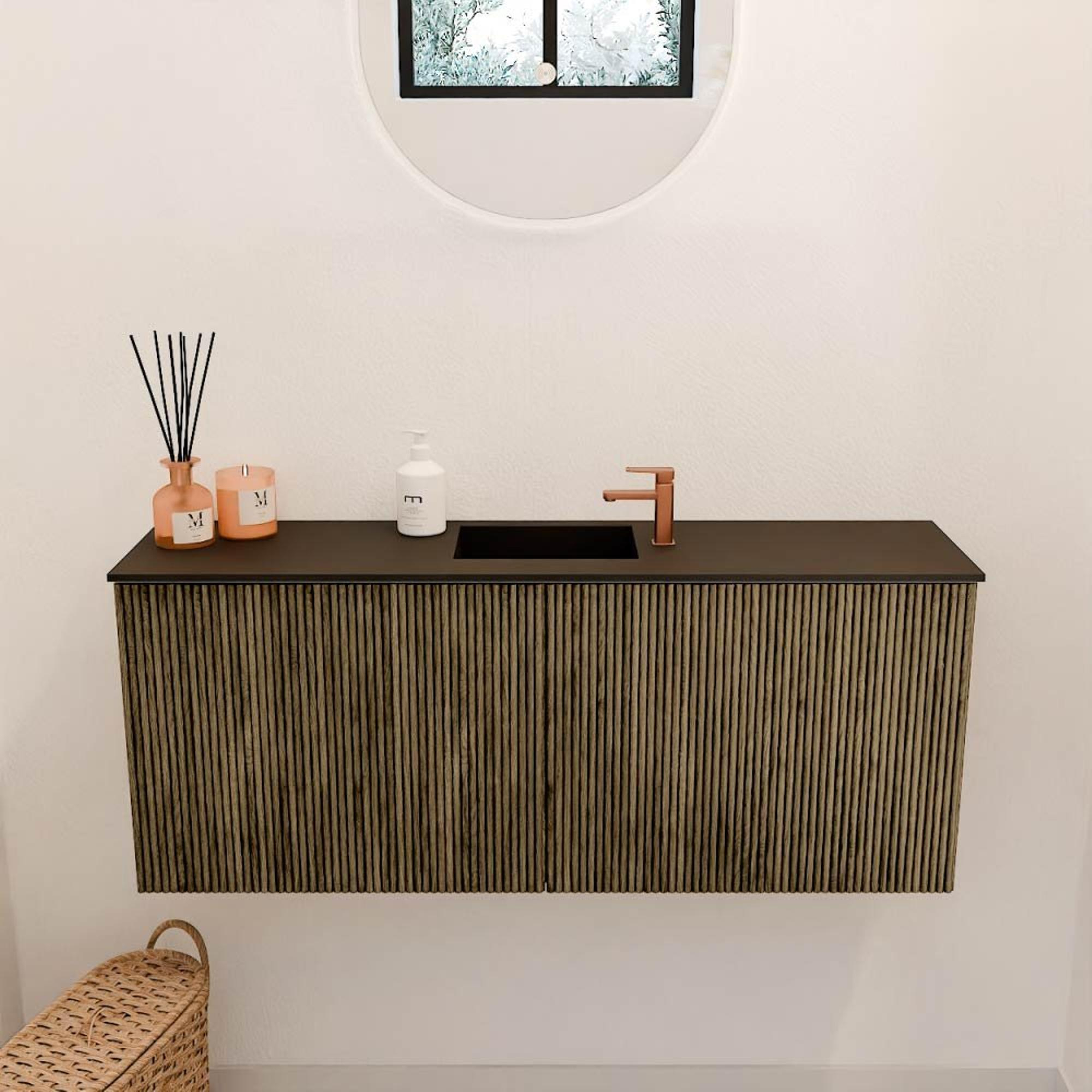 Het meubel valt meteen op door zijn moderne, verticale ribbelstructuur die een speels maar toch strak effect geeft. De kleur Dusk is een subtiele, diepe tint die warmte en rust uitstraalt, waardoor je badkamer een uitnodigende sfeer krijgt. De wastafel in Urban-kleur met een centraal geplaatst kraangat voegt een eigentijdse touch toe die naadloos aansluit bij het meubel. Door deze stijlvolle combinatie creëer je een badkamer die niet alleen functioneel is, maar ook een lust voor het oog. Zo geniet je elke dag van een ruimte die je met trots aan gasten laat zien.