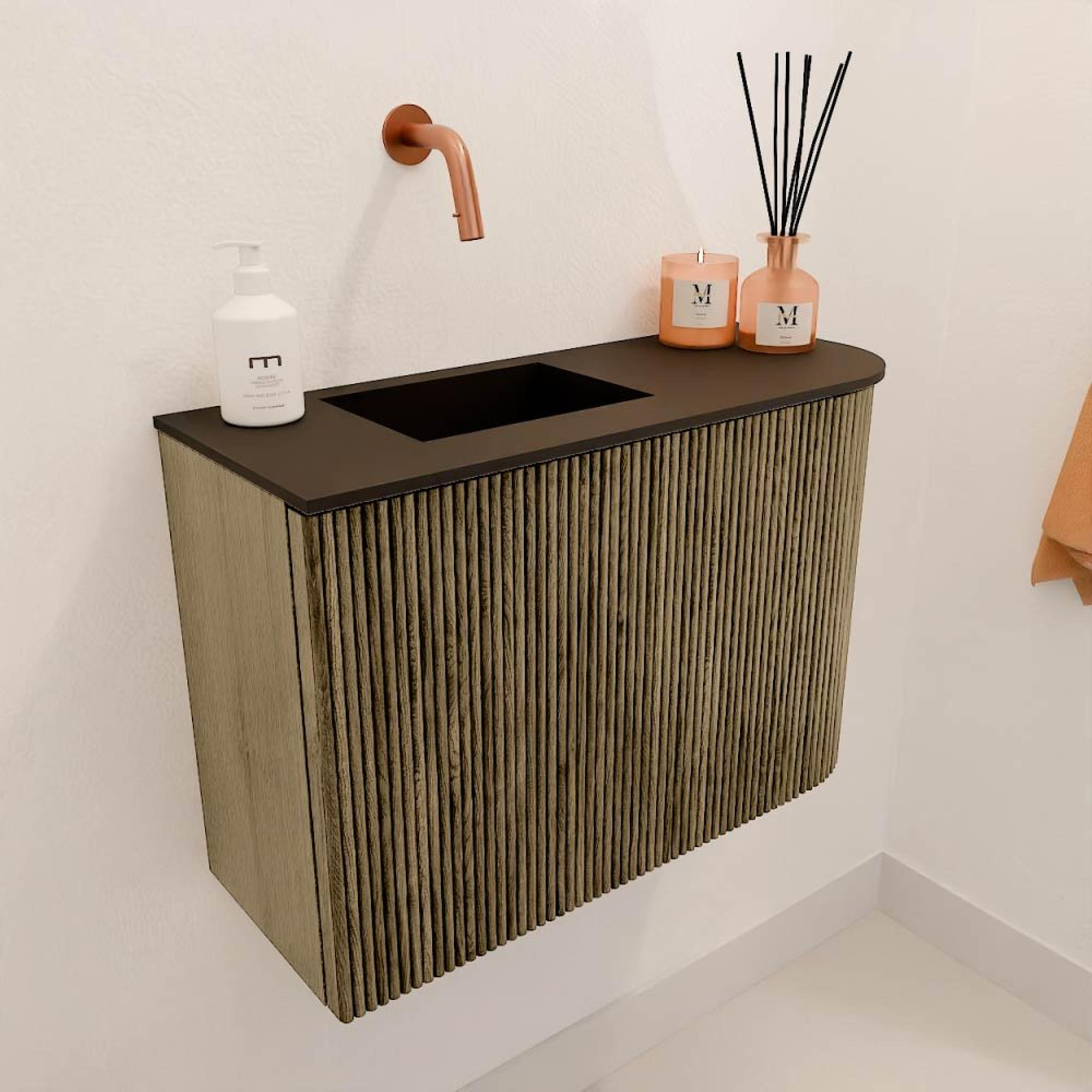 Met dit prachtige meubel geef je jouw badkamer direct een stijlvolle en warme uitstraling. De combinatie van het subtiele ribbelpatroon en de diepe kleur Dusk zorgt voor een tijdloos en toch modern design dat moeiteloos in diverse badkamerstijlen past. Dankzij het compacte formaat van 61,6 cm breed en de slimme ronding aan de rechterkant benut je zelfs kleinere ruimtes optimaal. De wastafel met de kraanpositie aan de linkerkant is strak vormgegeven en zonder voorgeboorde kraangat, waardoor je alle vrijheid hebt om jouw favoriete kraan te kiezen. Dit meubel nodigt uit tot een georganiseerde en rustgevende badkamer waar je elke dag met plezier begint en eindigt.