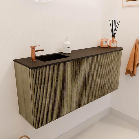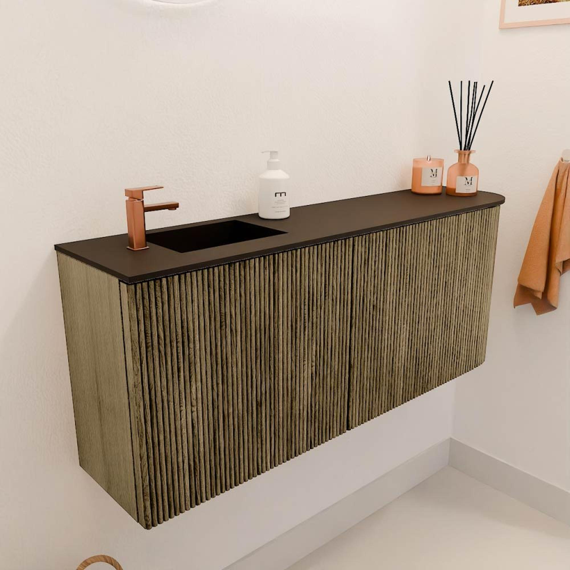 Het meubel valt direct op door het elegante ribbelfront en de warme kleur Dusk, die samen een moderne en toch natuurlijke uitstraling creëren. De combinatie van massief eikenhout en eikenfineer geeft het geheel een luxe en authentieke sfeer. Dit zorgt ervoor dat jouw badkamer niet alleen functioneel is, maar ook een plek waar je met trots gasten ontvangt. Het subtiele design met de afgeronde hoek aan de rechterkant maakt het meubel uniek en geeft een zachte, uitnodigende uitstraling.