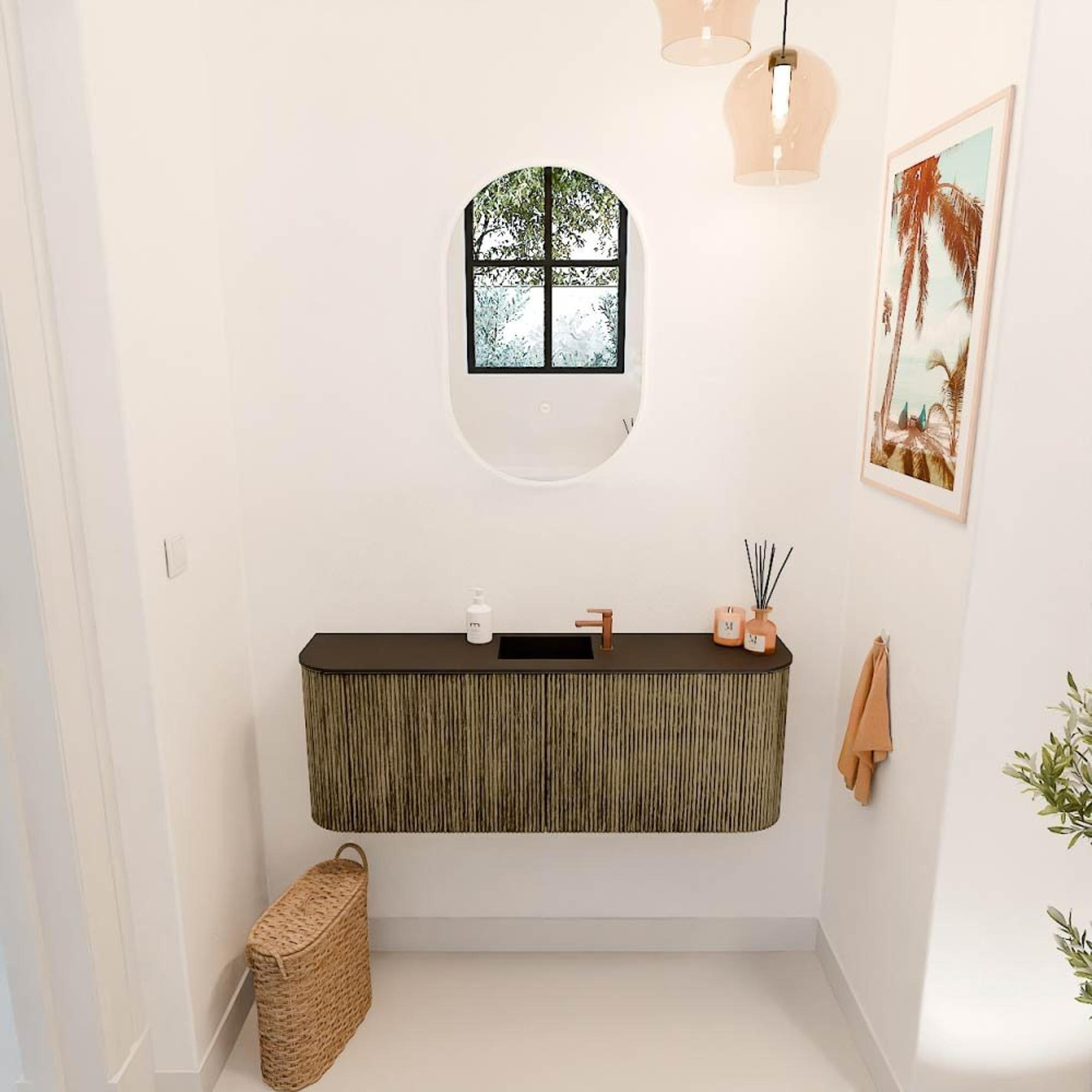De combinatie van het donkere Dusk-meubel met het Urban wastafelblad zorgt voor een verfijnde en moderne uitstraling die moeiteloos in verschillende badkamerstijlen past. De ronde vormen aan de linker- en rechterzijde geven het meubel een zachte, organische uitstraling die het geheel minder hoekig maakt. Dit maakt het meubel niet alleen een blikvanger, maar ook een sfeermaker in jouw badkamer. Door het gebruik van massief eikenhout en eikenfineer straalt het meubel kwaliteit en vakmanschap uit. Zo geniet je van een badkamer die niet alleen mooi oogt, maar ook een warme en uitnodigende sfeer creëert.