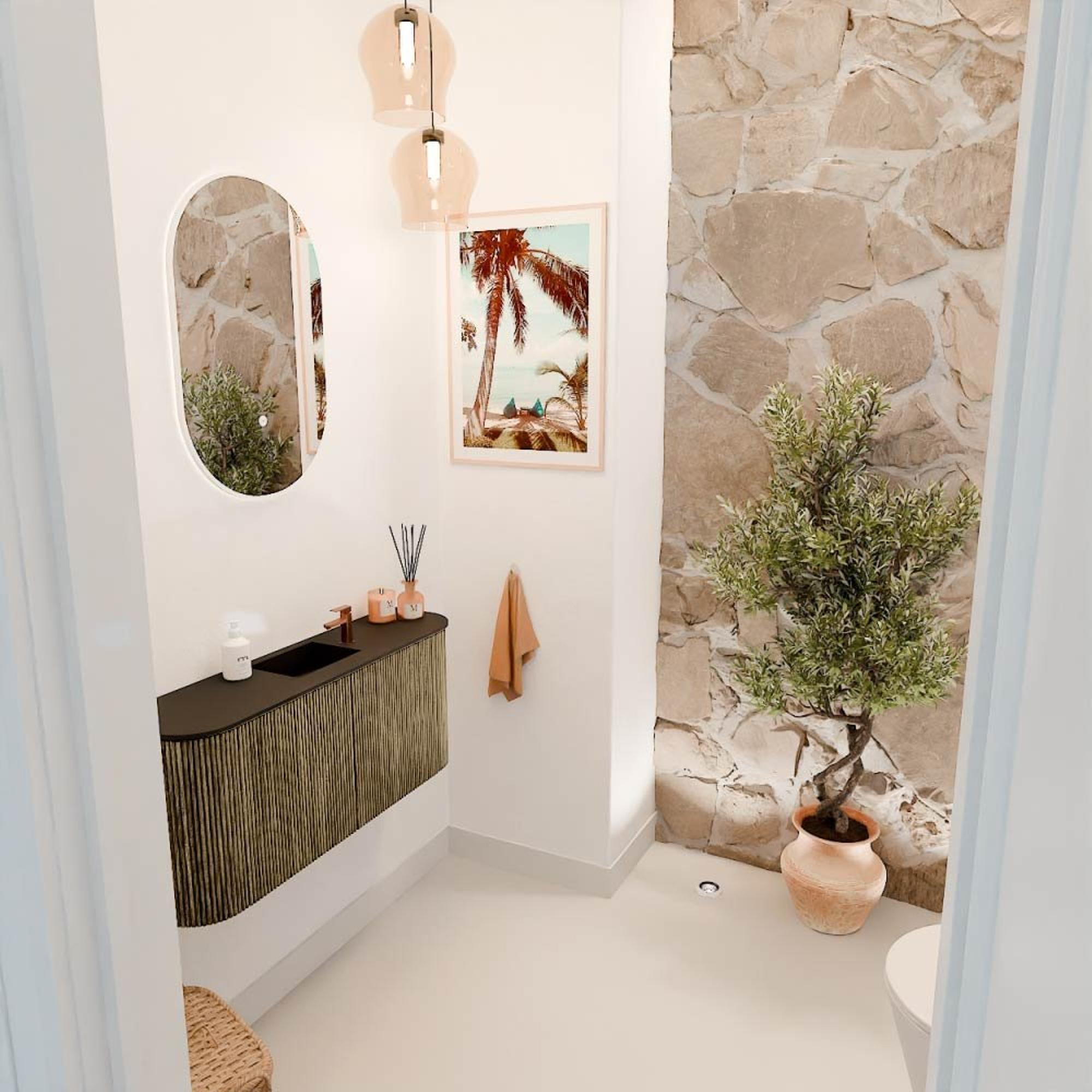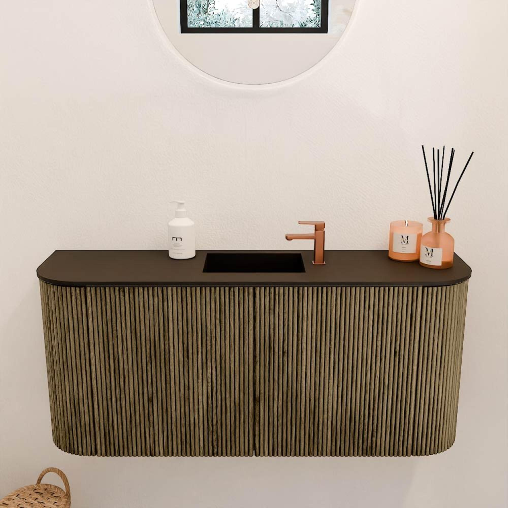 Het meubel valt direct op door zijn elegante vormgeving met ronde zijden en een verfijnde kleurstelling in Dusk en Urban. De verticale ribbels geven het een moderne twist, terwijl de natuurlijke houtafwerking warmte en karakter toevoegt. Zo creëer je een badkamer die niet alleen functioneel is, maar ook een echte sfeerbepaler. Door de doordachte combinatie van kleuren en materialen past dit meubel moeiteloos in zowel strakke als meer klassieke badkamers. Het resultaat? Een tijdloos design dat je interieur verrijkt en je badkamer een luxe uitstraling geeft.